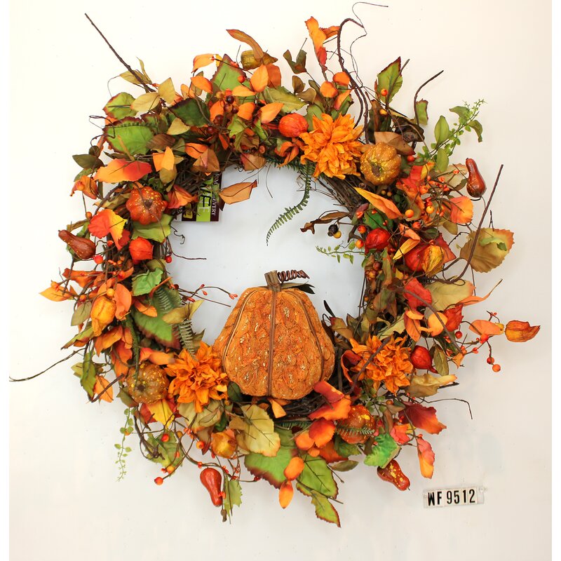 A great fall wreath. This wreath features one large pumpkin, and mini pumpkin, and an assortment of berry. It sits on a natural grapevine. It is great for your front door (cover and shaded), backdoor, or use as a centerpiece.