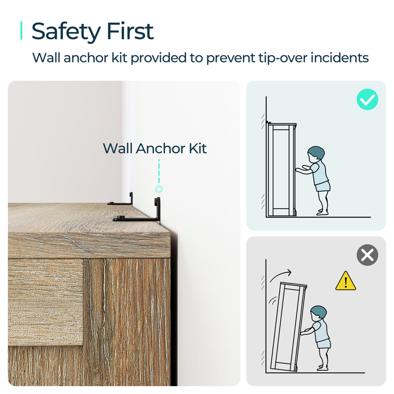 Safety design: Wall anchor kit provided to prevent tip-over incidents. The back of the bookcases is also equipped with a stabilizing device, which makes the bookshelf more stable and durable.