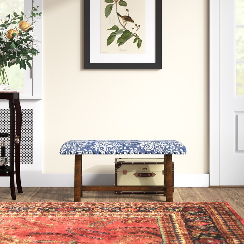 Add stylish seating to your hallway or entryway with this upholstered bench. Crafted with a solid wood frame, this bench is upholstered in 100% cotton fabric. A rectangular top showcases rounded corners and a boho-inspired pattern with scrolling leaves, topped off with metallic nailhead trim on the bottom edge. We love the sawhorse base gives this piece a rustic, barn-inspired touch. At 34” long, this bench has a small footprint that works well in small spaces and supports up to 375 lbs.