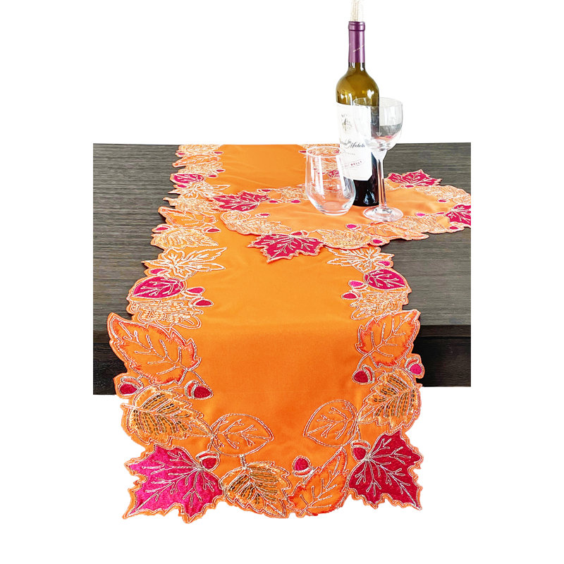 Adorn your table with harvest spirit using the Embroidered Autumn Leaves Table Runner. Featuring rich foliage in shimmering embroidered and sequin designs in a warm, vibrant color palette brings a festive look and autumnal elegance to your dining table. This table runner perfectly captures the essence of everyday use during fall, paired with matching placemats and seasonal accents to create a homey, yet chic setting.