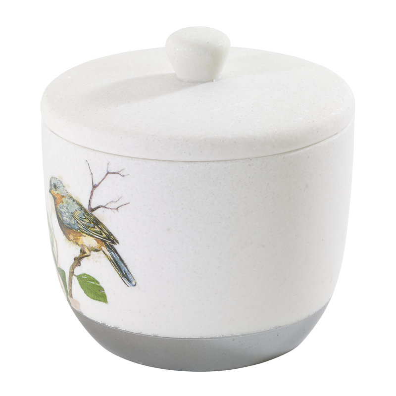 Beautiful birds jar. Matches the toothbrush holder. Very useful size for cotton balls etc.colors are vivid and nicely painted.