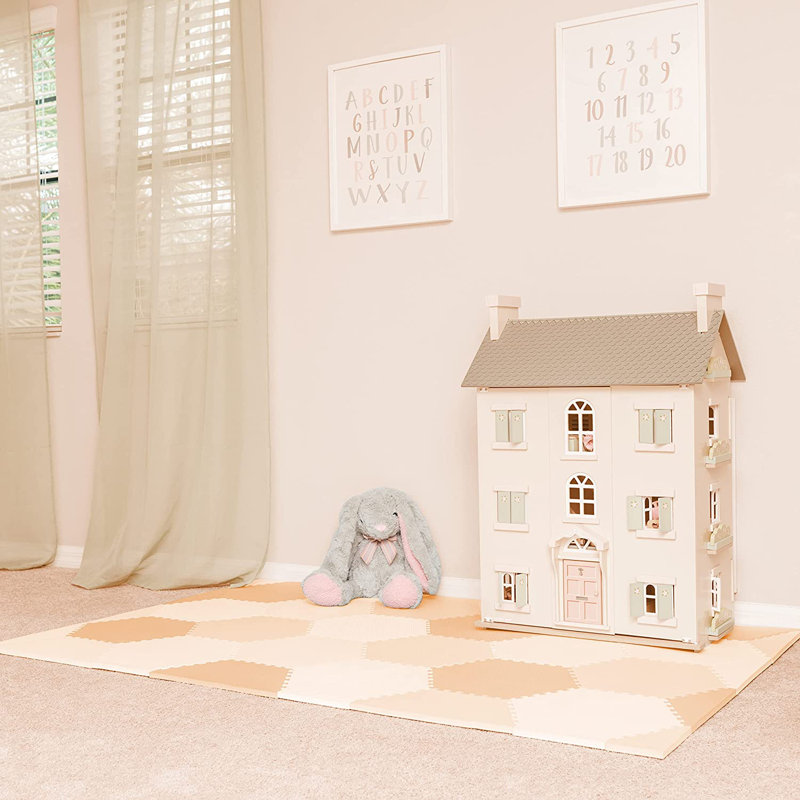 Large & thick: 38 Tiles Include 18 hexagon tile play mats, 6 half hexagon tiles, 8 triangle, 6 edge tiles with borders. Extra Thick 12 MM foam measures 4 x 6 feet (48†x 72â€) when assembled.