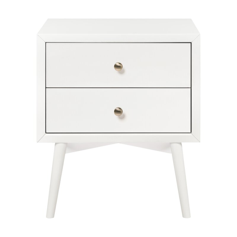 The Palma nightstand with a USB port is a sophisticated mid-century-inspired design with tapered legs, brushed metal hardware, and two smooth-glide drawers. Easy setup with minimal assembly required.