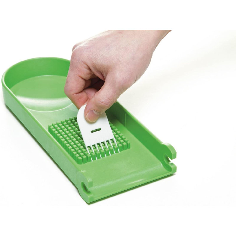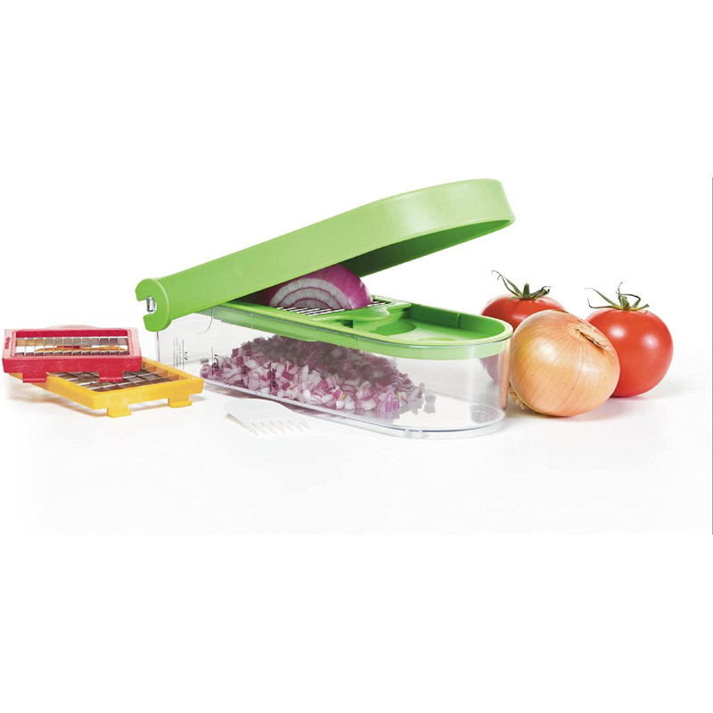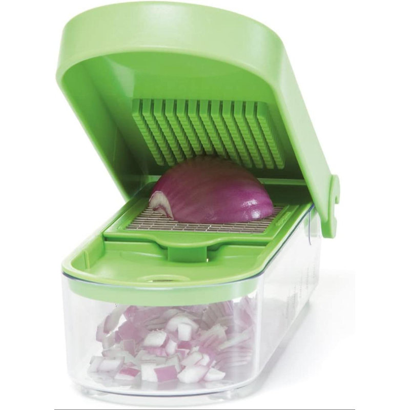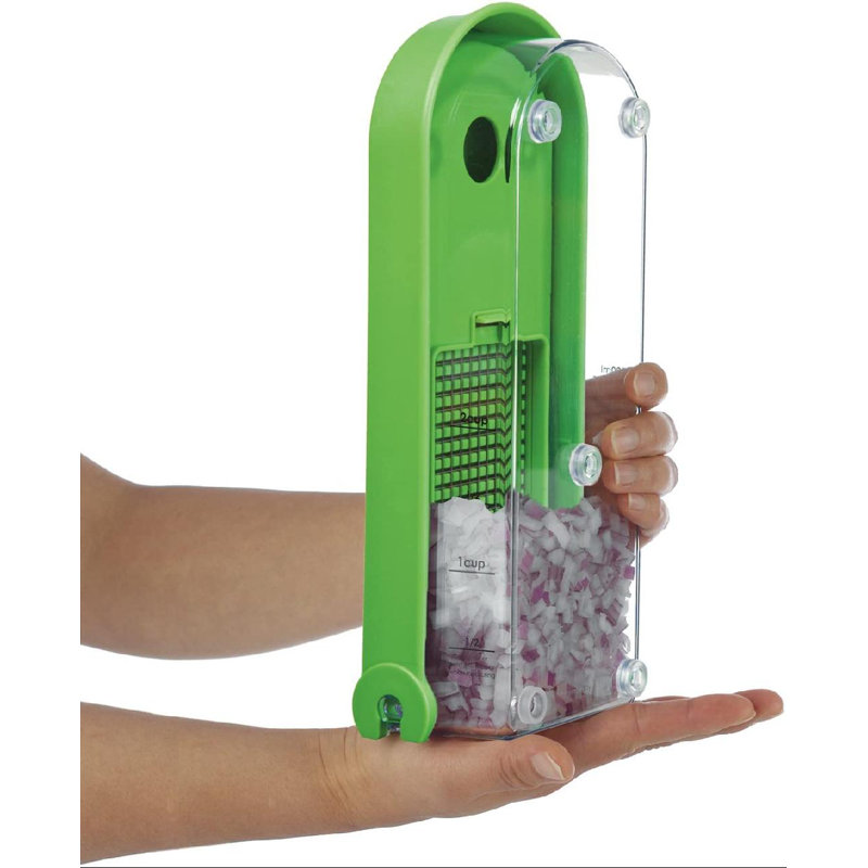 Clear base container catches cut fruits and vegetables, features printed measurements up to 2 cups/500 ml