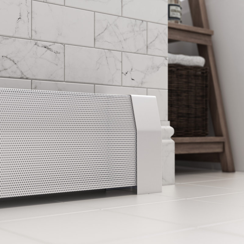 The easy slip-on baseboard heater cover instantly rejuvenates ugly old, yet perfectly functional baseboard heaters. baseboards are the only one-size-fits-most perforated steel baseboard heater covers that just slip over your existing baseboard heaters. Only the original front plate and end caps are removed/recycled. Installation takes a couple of minutes and does not require the use of tools or hired help. The one-piece design uses heavy-duty 22 gauge (0.033 in. Thick) galvanized steel that stands up to years of physical and chemical abuse. The pristine semi-gloss white powder-coated finish can also be painted with a color of your choice using a roller or spray that can apply for a custom look. Baseboarders are considered child safe for their complete lack of exposed sharp edges while blocking access to the heating element from the top. Baseboarders can also be installed in new construction environments or when the original covers have been completely removed and all that remains is the bare-finned tube heating element. Slips over the original baseboard heater – just remove the existing front panel and end caps. Galvanized steel with a powder-coated semi-gloss white finish. DIY installation, no tools, no hired help. Available in all industry standard lengths (use multiple panels and a coupler for lengths longer than 7 ft.). As seen on “Ask This Old House” it. Made in Canada and the United States. Use caution when using electric baseboard heaters* as they operate at higher surface temperatures. *When using electrical appliances, basic precautions should always be followed to reduce the risk of fire, electric shock, and injury to persons.