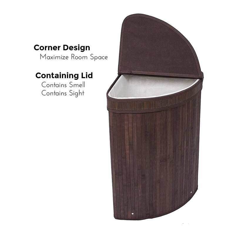The corner laundry hampers with lid and cloth liner are a great addition to any bedroom, laundry room, or bathroom. It is specifically designed to fit in a typical 90-degree room corner, maximizing space while staying out of the way. The hamper features a lid keeping dirty clothes out of sight while also concealing any smells. The cloth liner is washable, making it great for many uses (cold water, gentle cycle: air dry or low tumble dry). It is constructed from natural bamboo, and the hamper offers you a durable yet lightweight solution to organizing your dirty clothes. The hamper can fit one standard-sized load of laundry. Our laundry hamper will help you keep your home organized without being a big eyesore. It helps keep dirty clothes off the floor by offering a single location for your dirty clothes.