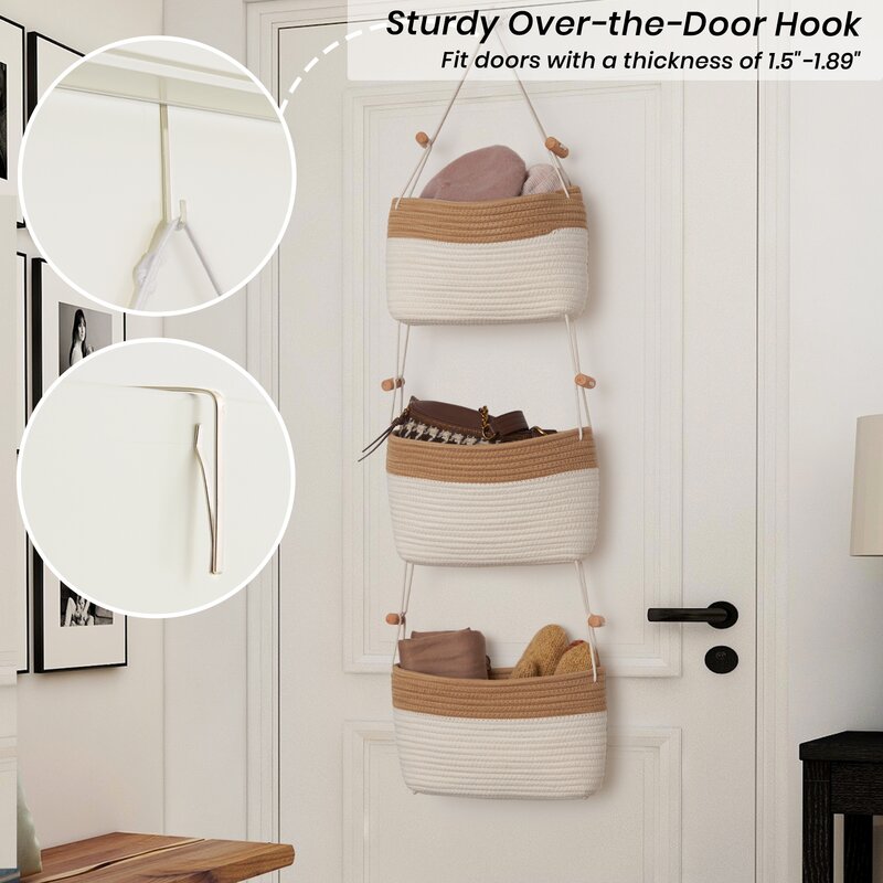 This woven basket trio is very well made with soft sturdy weaving and ropes knotted all the way down the back of the set.It comes with a strong hook for easy hanging.We will use it to keep mail in, organize cords/chargers or even linens.