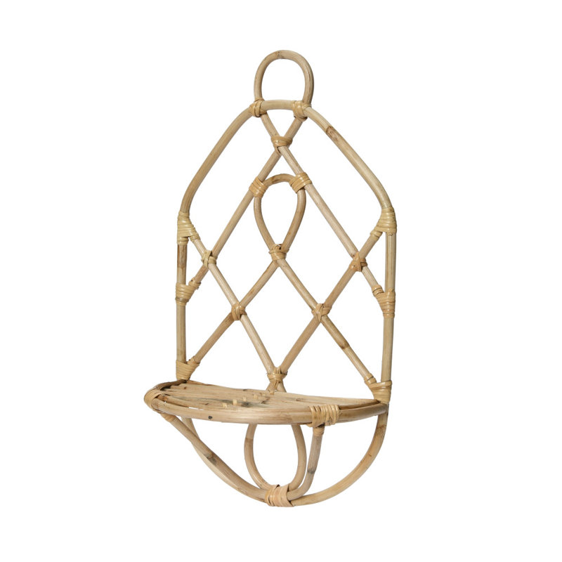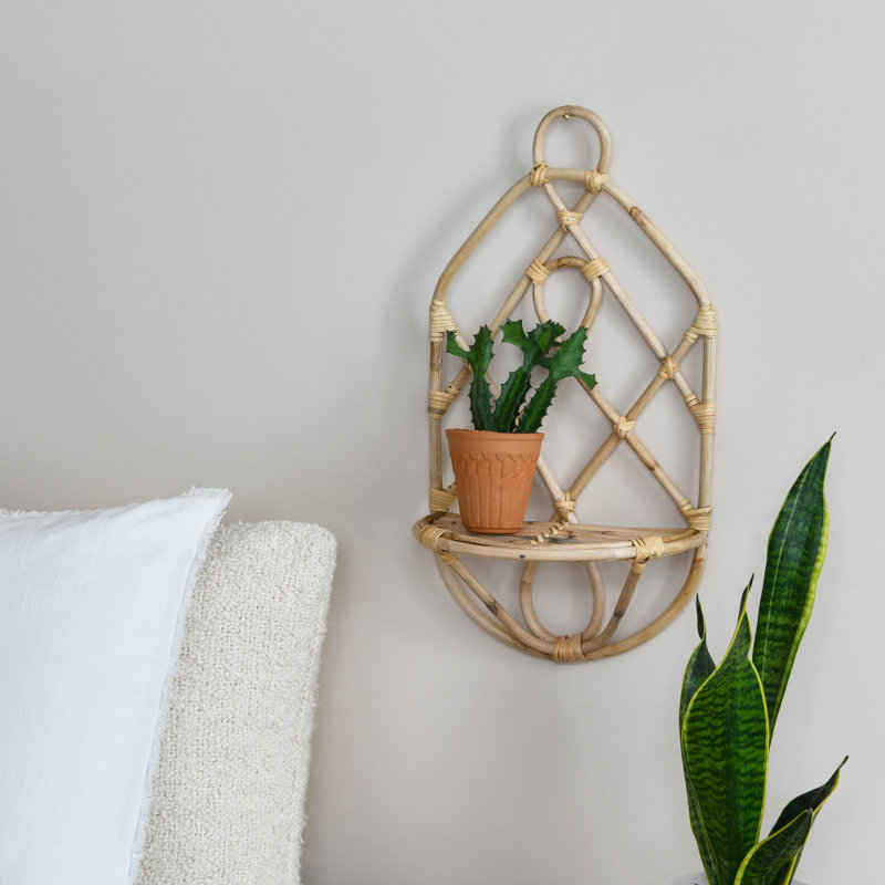 This boho-inspired wall shelf features expertly woven rattan in a natural finish
