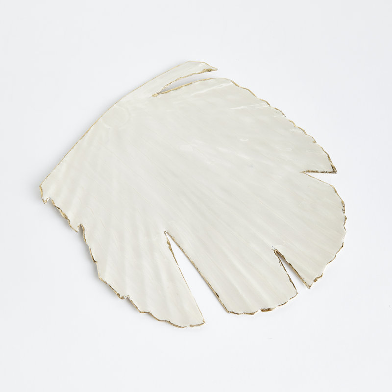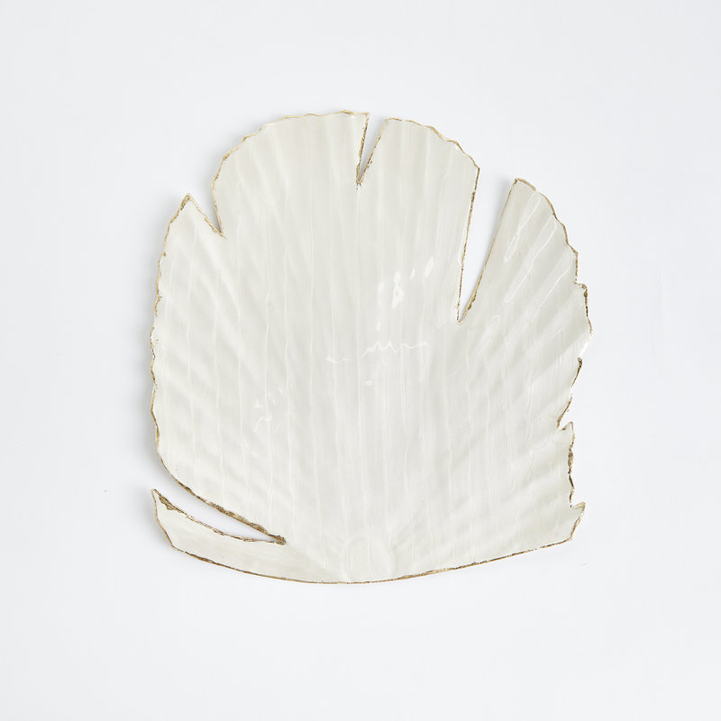 This nature-inspired charger with a palm leaf motif is a whimsical take on the coastal look. Made of a shiny enameled metal with a hand-applied gold edge, the unique foundation for a creative tablescape.