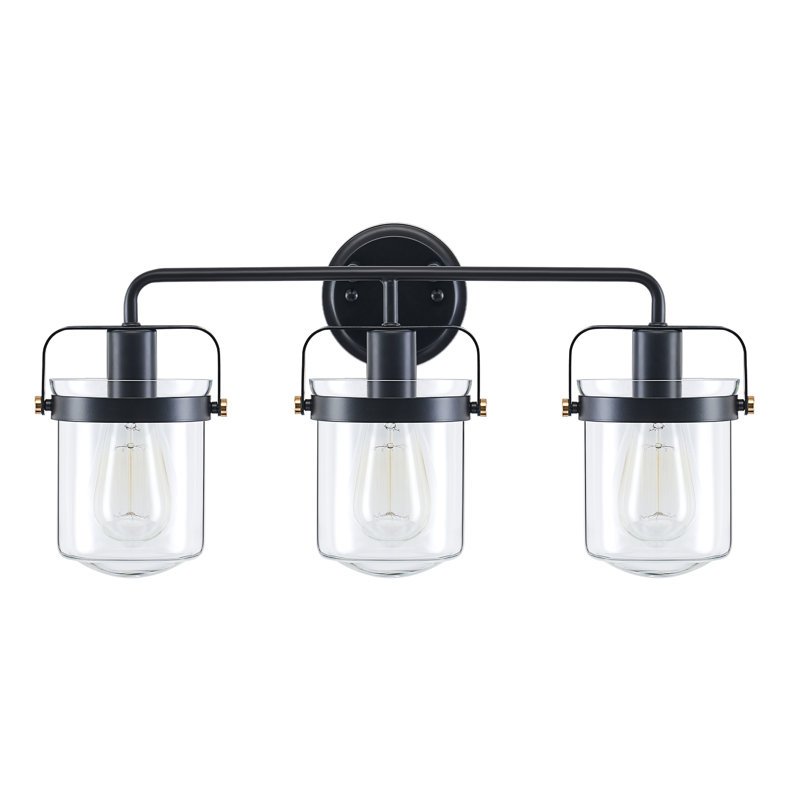 This vanity fixture fills any room, large or small, with a modern vibe and sleek minimalism. Made from metal with a black finish, it has a circular backplate and a horizontal bar that curves down at either end to a lantern-style holder. Surrounding each of the dimmable 60W max bulbs (sold separately) are classic clear glass drum shades that cast a soothing ambient glow throughout your space. Since it’s rated for damp locations, this vanity light is safe to install in bathrooms with steamy showers.
