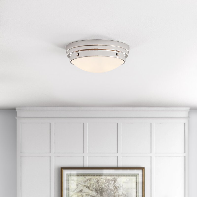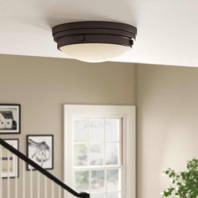 Cast a warm glow over any ensemble and add a bit of understated appeal with this 2-light flush mount, the perfect piece for any low-key aesthetic. Hang it up in the entryway to let its white-frosted glass diffuser illuminate the foyer, or add it to the living room to brighten up your well-used seating group. Featuring a molded metal mount with subtle bolt details, this piece almost resembles a porthole, giving it a subtle nautical tinge that’s perfect for coastal aesthetics. It accommodates two 60W bulbs, which are not included.