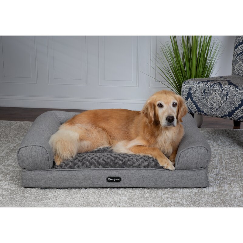 Your dog can nap and relax in this comfy luxe lounger! The supportive, contouring charcoal-infused shredded memory foam sleep surface helps reduce pressure points that may cause your dog discomfort while also minimizing odors. The large bolsters support your pets head and neck and provide a sense of security. Dualcool technology promotes lasting freshness. Available in multiple sizes and colors!