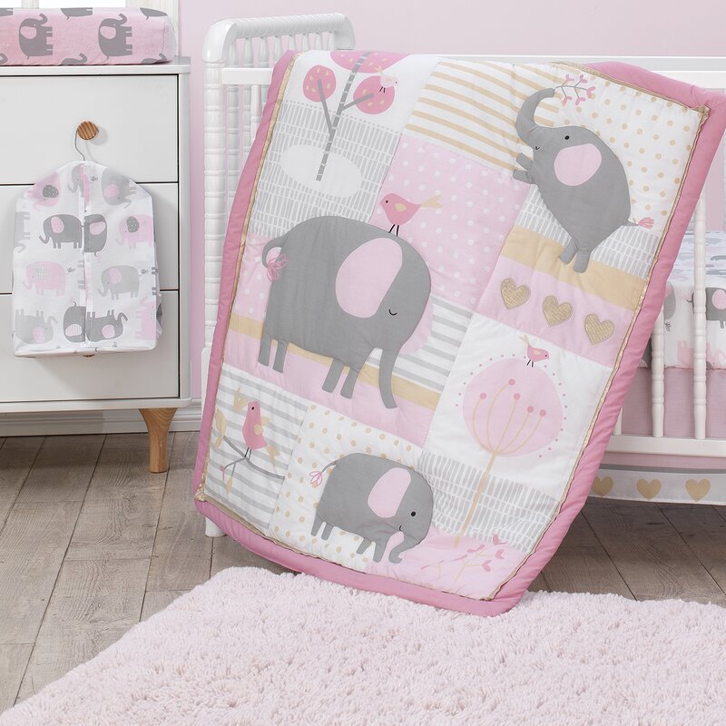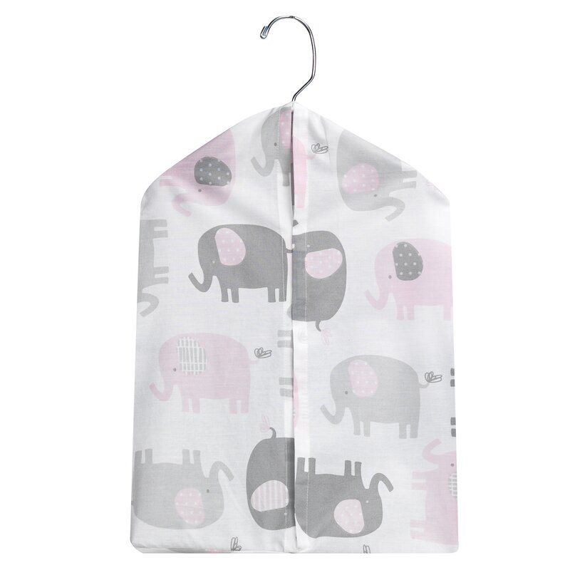 This diaper stacker has tossed elephants in pink and gray. It is a cotton-poly blend. Holds approximately 30 diapers and includes a swivel hanger.
