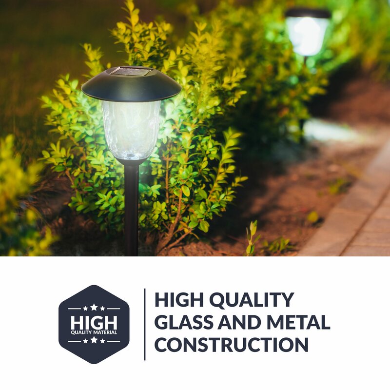 High-quality glass & metal outdoor lights: durable and weatherproof glass and metal construction. Top, post and stake all made of durable metal