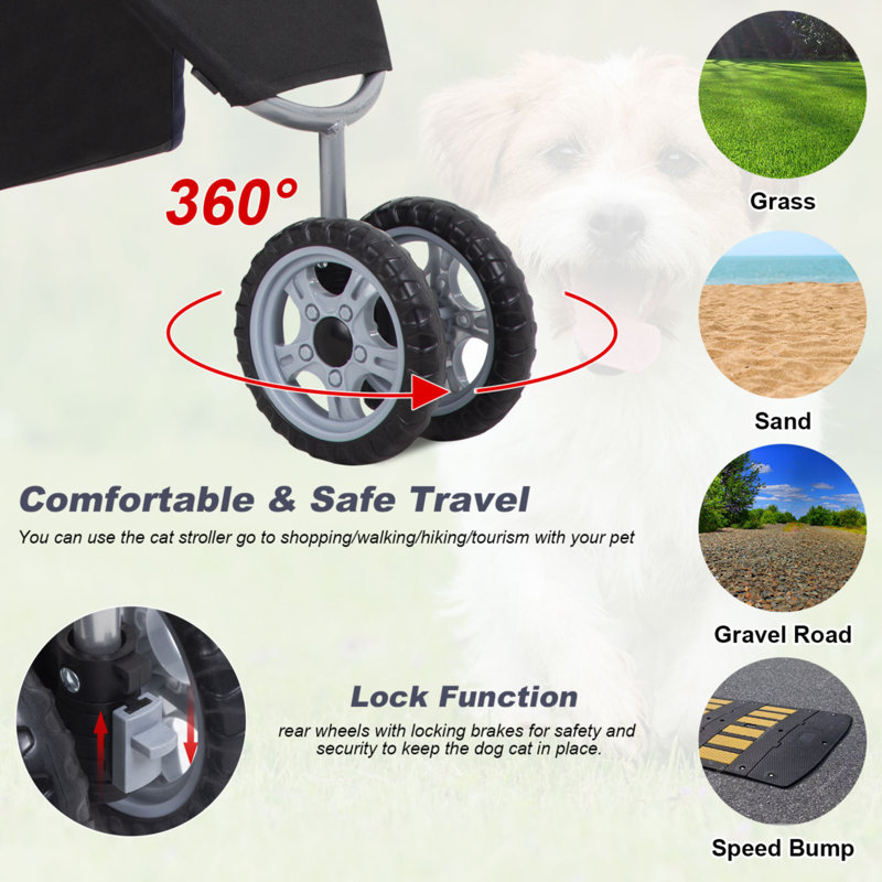 Comfortable use for pet owners, Pet Stroller the top handles feature soft padding to keep your hands comfortable on long walks. For pets, the Dog carriers & strollers have comfortable cushions, so pets can stay in them for a long time. During use, the pet cart can bring comfort to both parties, even if it is used for a long time. Pet stroller cat stroller dog stroller puppy stroller