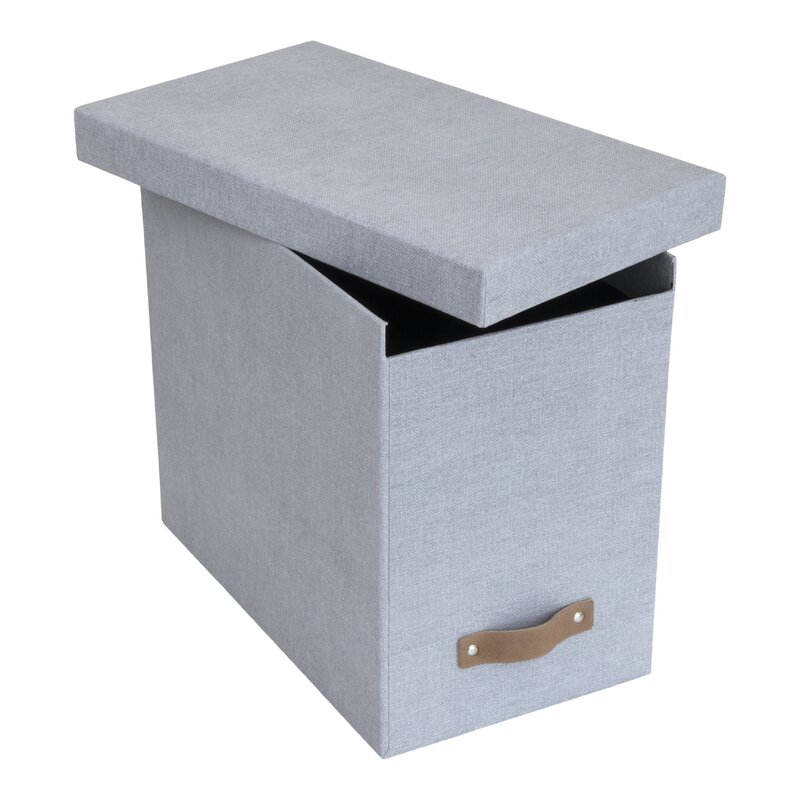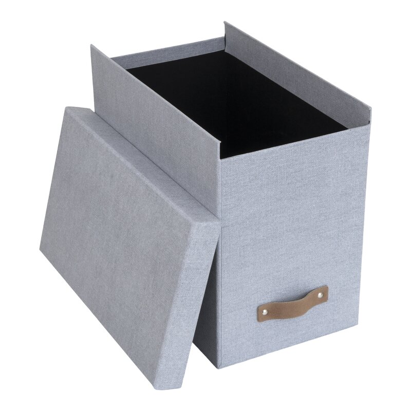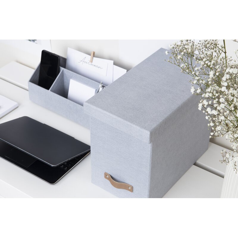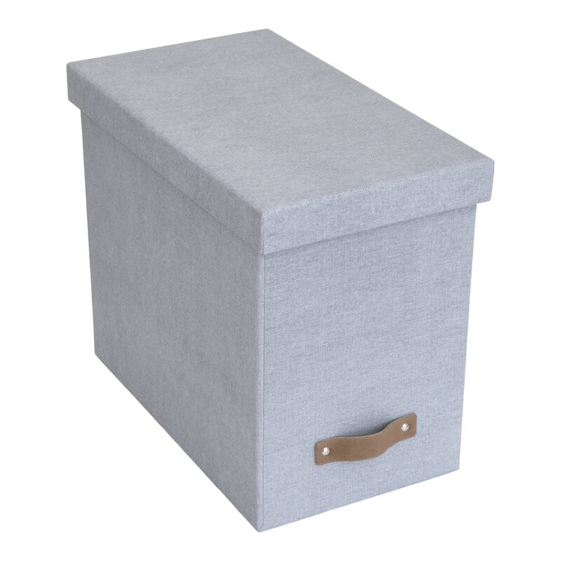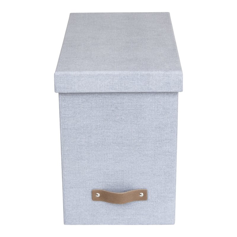 The John File Box keeps hanging files hidden and easily accessible. Doesn’t include files. Innovative lid design keeps contents hidden. Covered in ash grey canvas-like textured paper over a thick recycled fiberboard core. Includes a distinctive leather pull. Made by hand in Lithuania for Big so Box of Sweden.