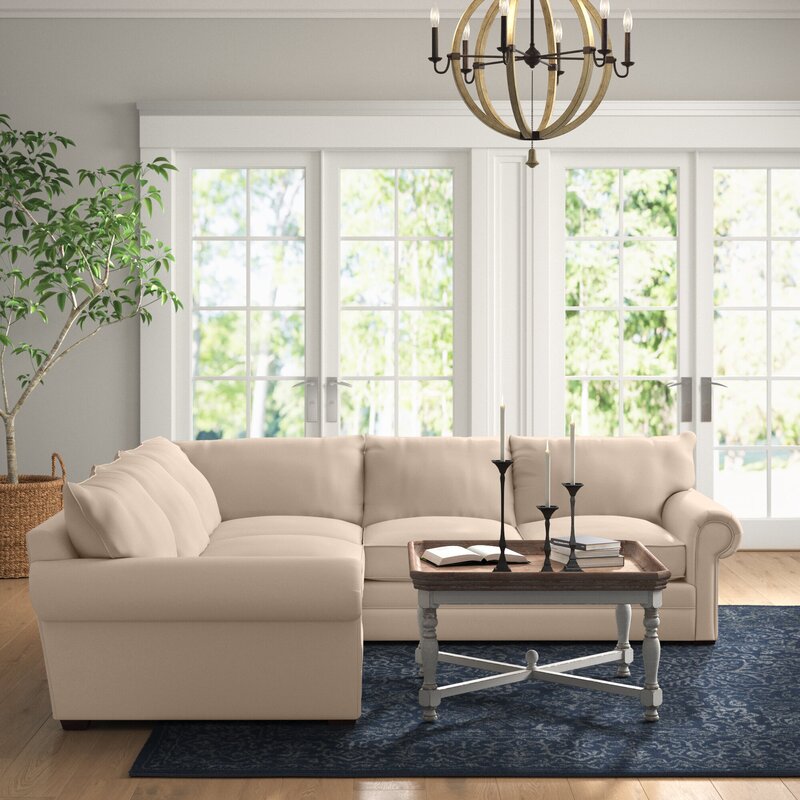 If you’re looking to add more seating to your living room or den, this product is the perfect place to kick back and relax. Made in the USA, this sectional sofa is crafted on a solid and engineered wood frame in a solid hue and features a left- and right-hand-facing orientation that can easily fit in any corner. Its rolled arms and pillow back are upholstered in a cotton and polyester blend, while a down fill and sinuous springs give you and your guests a supported place to sit. This sectional can comfortably sit up to four guests.
