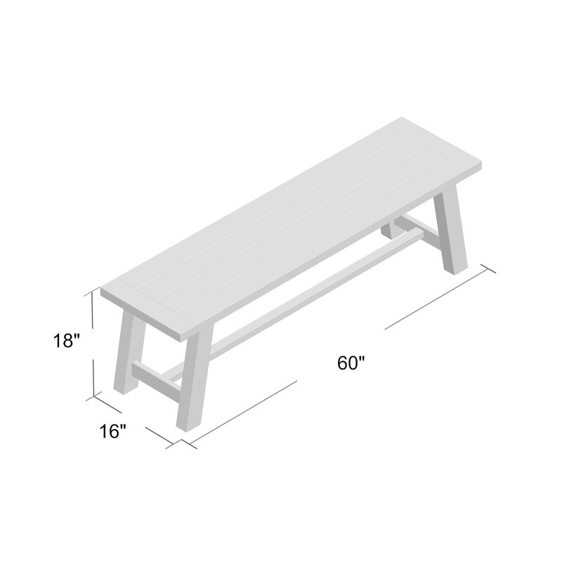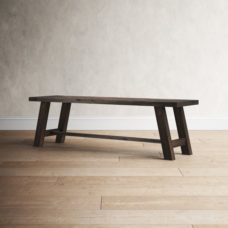 Bring a streamlined traditional style to your dining space with this wooden bench. Crafted of solid acacia wood, this bench strikes a clean-lined rectangular silhouette featuring plank panel constriction and a straight, thick edge. Featuring four flared chunky square legs, a sturdy trestle base rounds out the design.