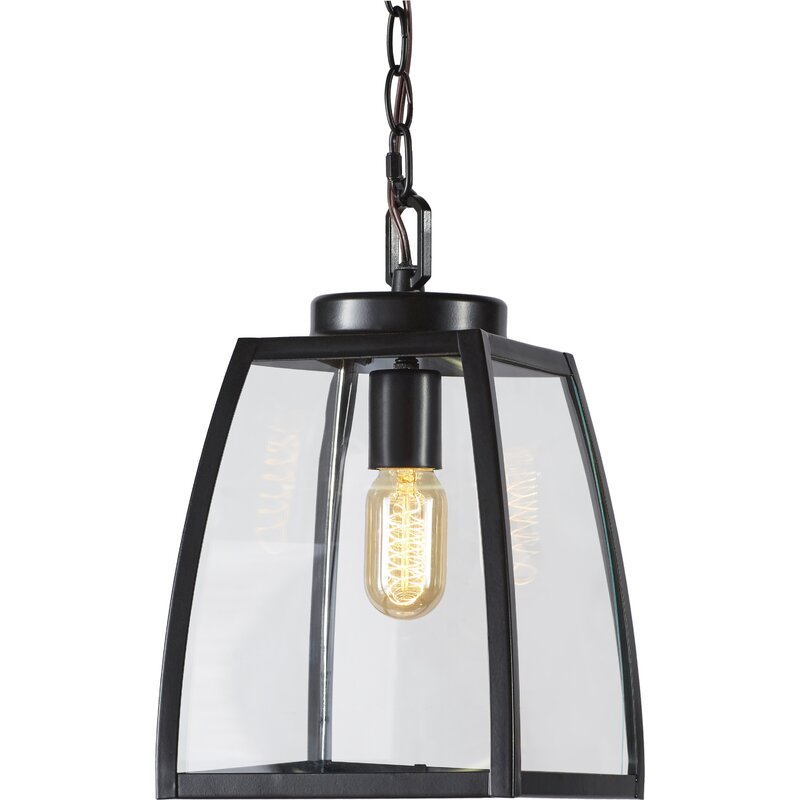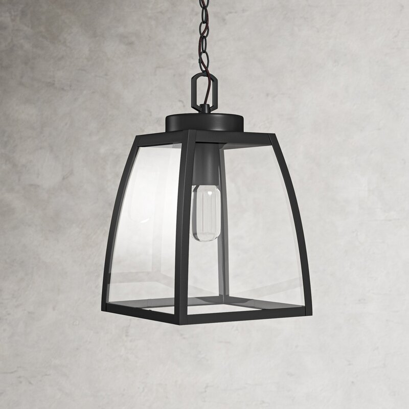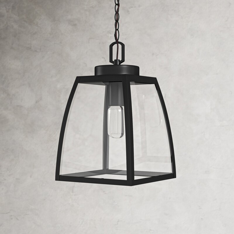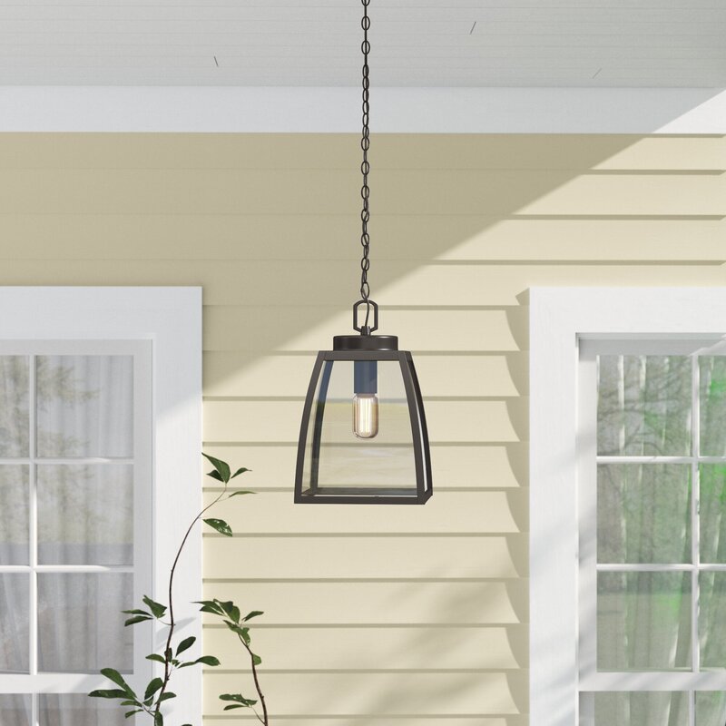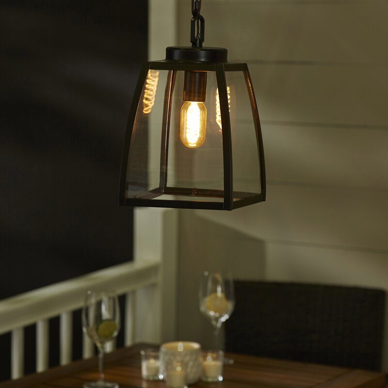 This outdoor hanging lantern is a versatile style that’s sure to fit right in with traditional or rustic patio decor. It’s crafted from steel in a dark, oil-burnished bronze finish with clear glass panes set in it. This outdoor pendant light strikes a tapered, four-sided bell silhouette with clean lines. It takes a single, standard medium-base lightbulb up to 60W (sold separately), so why not add an Edison bulb for a vintage-inspired touch? It hangs from an adjustable chain, so you can make sure the height is just right to hang above your outdoor dining table on your covered porch. Best of all, this hardwired pendant light stands up to outdoor moisture.