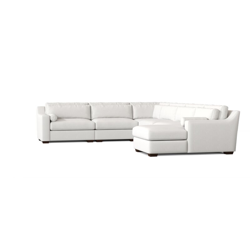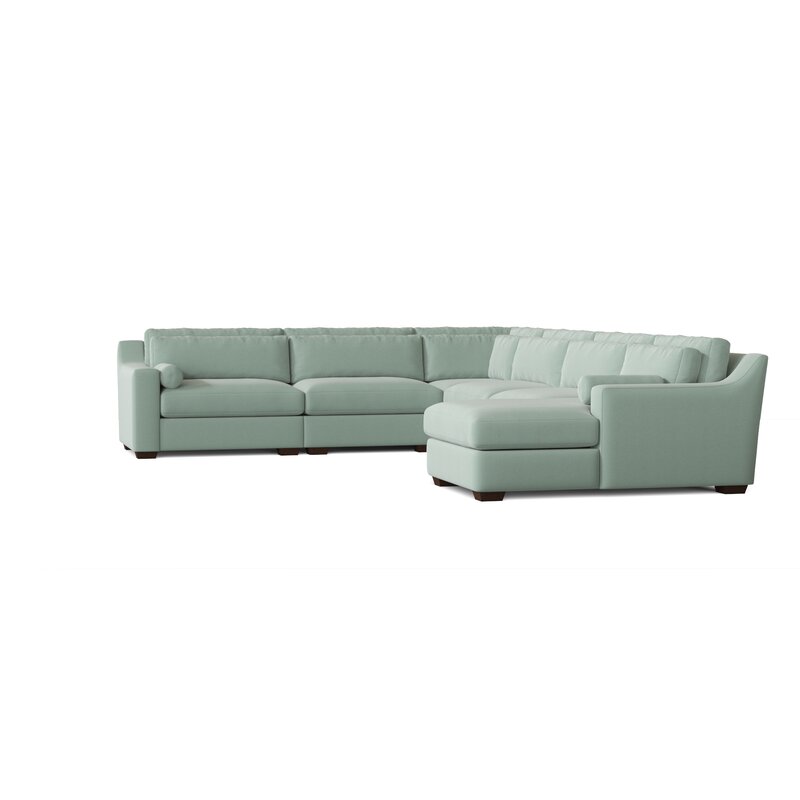 The corner sectional is a large-scale, relaxed, track arm group. A row of kidney pillows line the back cushions and an assortment of arm pillows and bolsters add a touch of interest.
