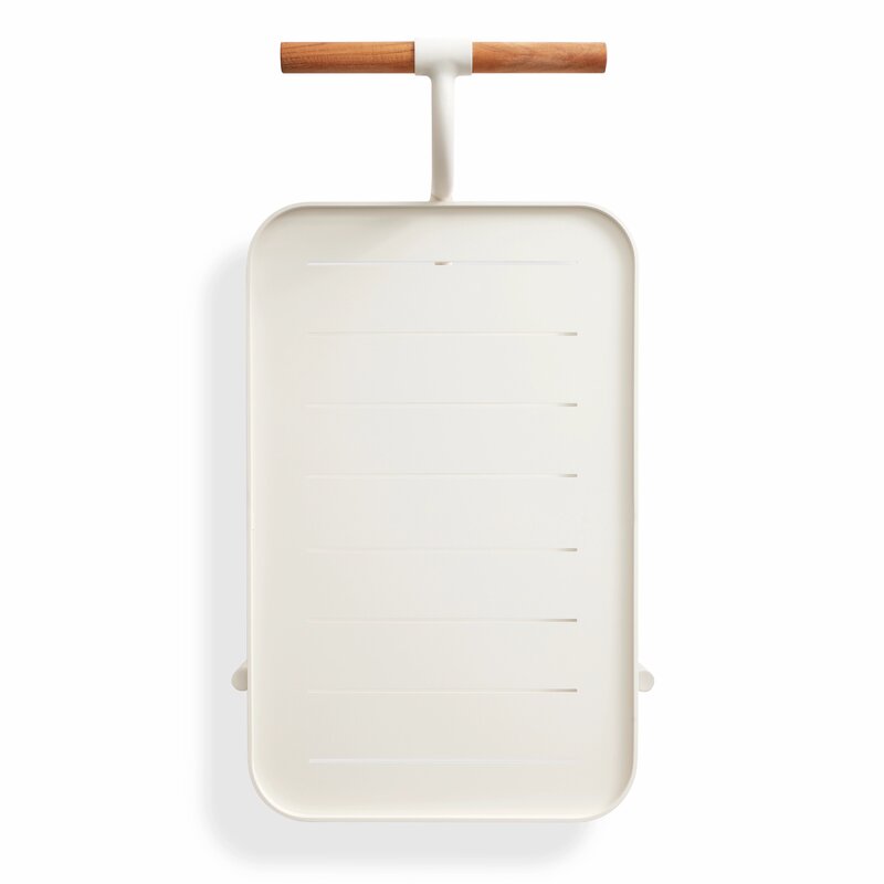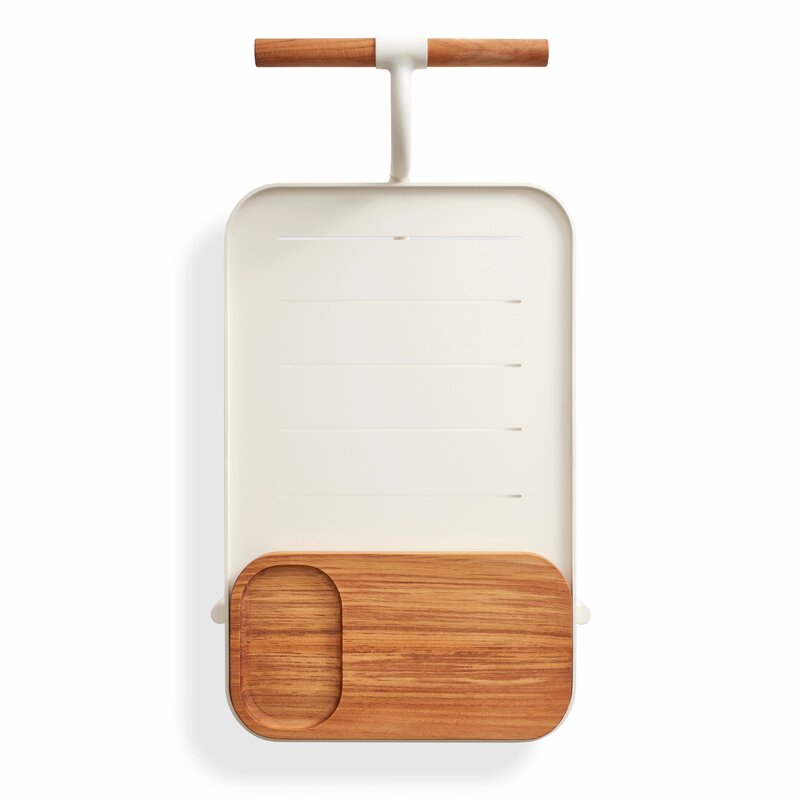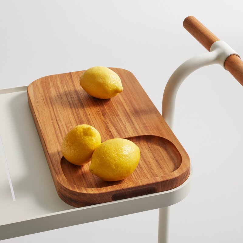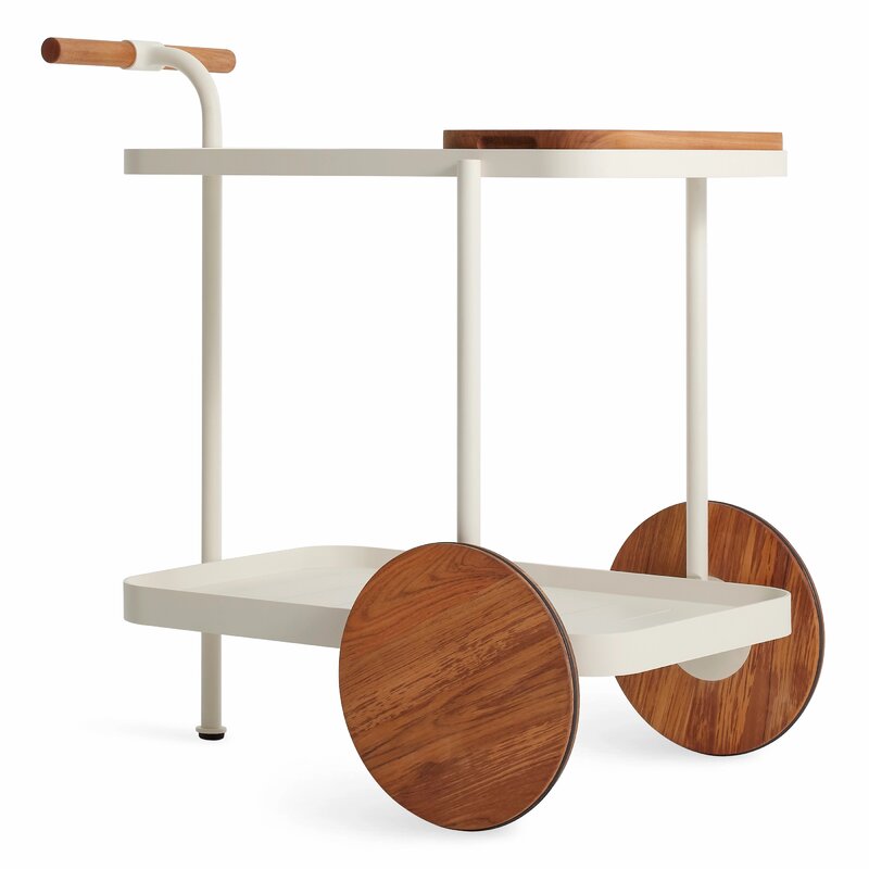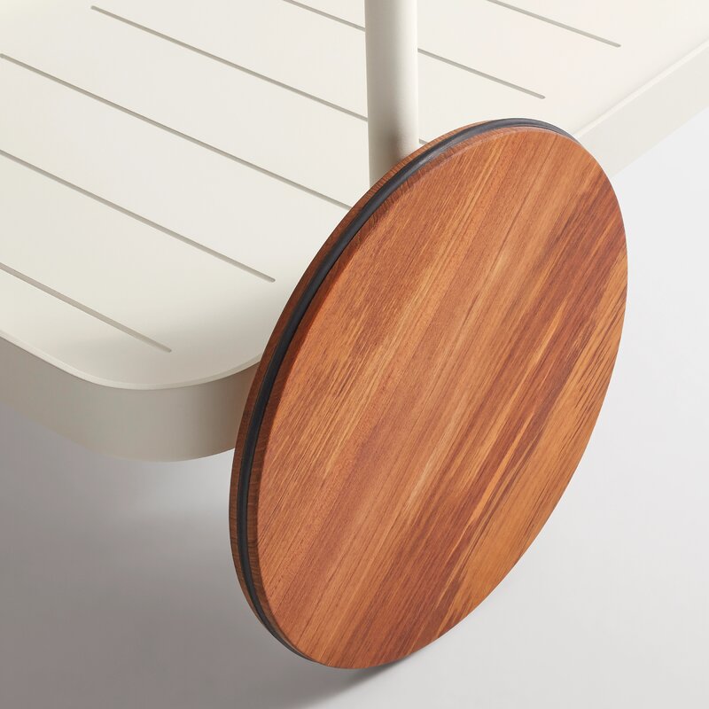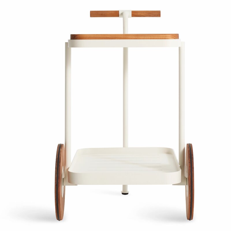 Drink it in. Solid teak makes the perfect garnish for perforated powder-coated aluminum. Fetching teak wheels take you from the patio to the parlor. The cutting board tucks neatly inside the top shelf for lemon slicing on the go and drinks on the double. It’s the stuff of soirées and Wednesdays.
