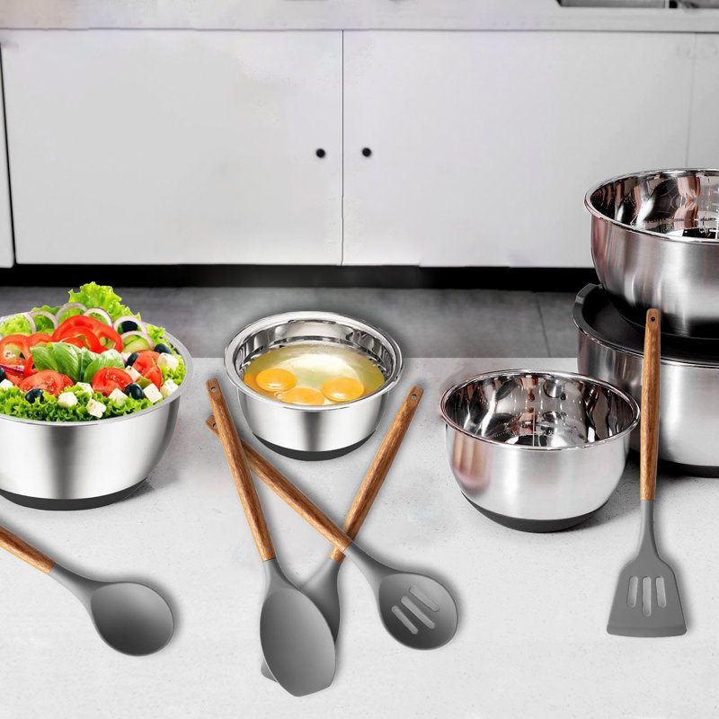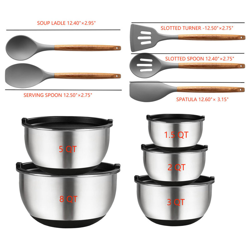 5-Piece stainless steel mixing bowl with cover, anti-slip base design (black and silver).