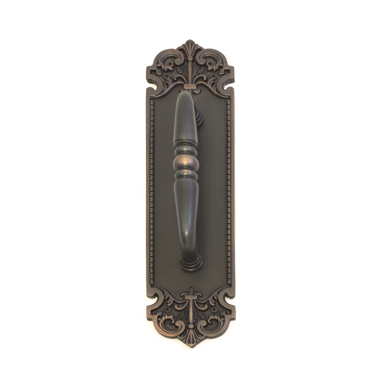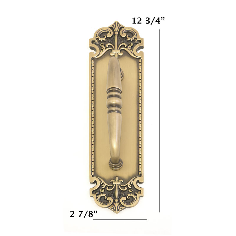 Hot-forged brass in the traditional style of the 1800s, the design is taken from Louis xvi school of architecture c.1774-1792 featuring the ever-popular fleur de lis which for centuries had stood as a symbol of the old French monarchy. This classic design really comes alive in antique brass and Venetian bronze. All brass accents finishes are hand-rubbed and assembled in the USA. The flat surface area of the plate is 2-3/8″ x 7-3/4″.