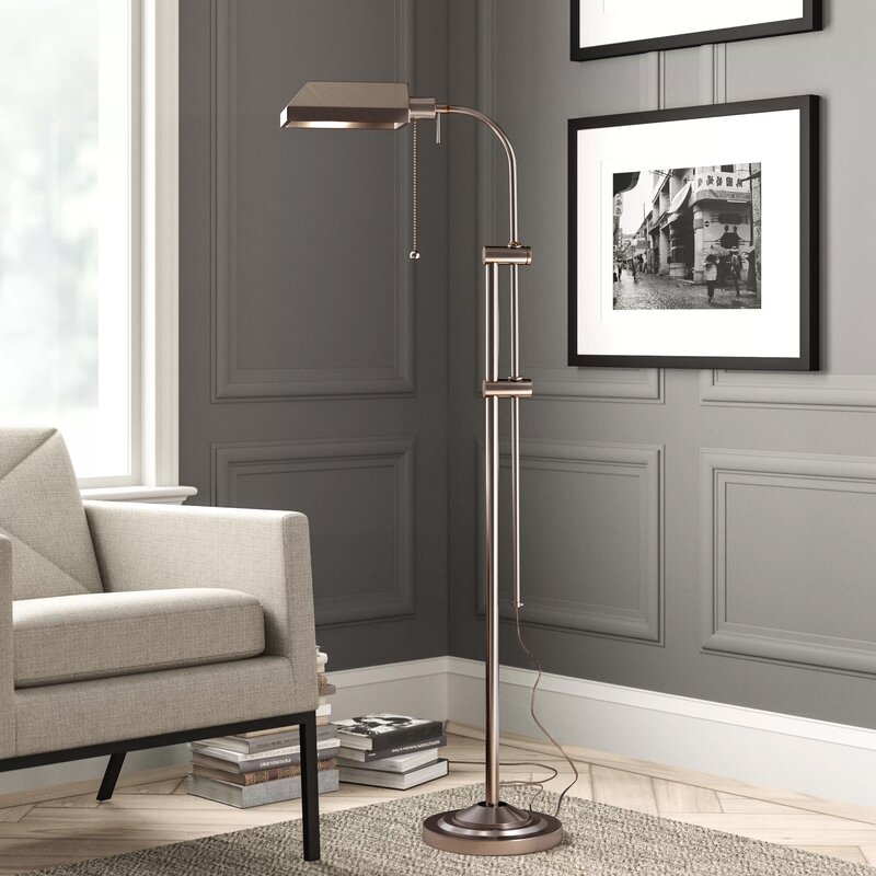 Ideal for reading nooks and living rooms alike, this Perran 57″ Task Floor Lamp brings both styles and shine to your space. Crafted from metal with a brushed finish, its frame features a dual-arm design and an arched silhouette for a traditional look. Up top, a single light is highlighted by an angled shade to evenly distribute a warm glow throughout your ensemble.