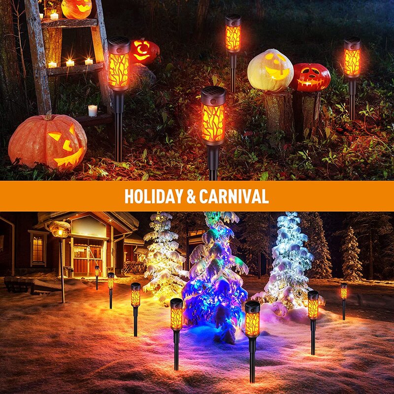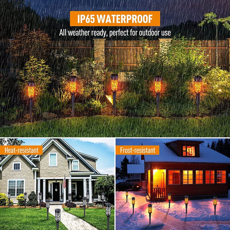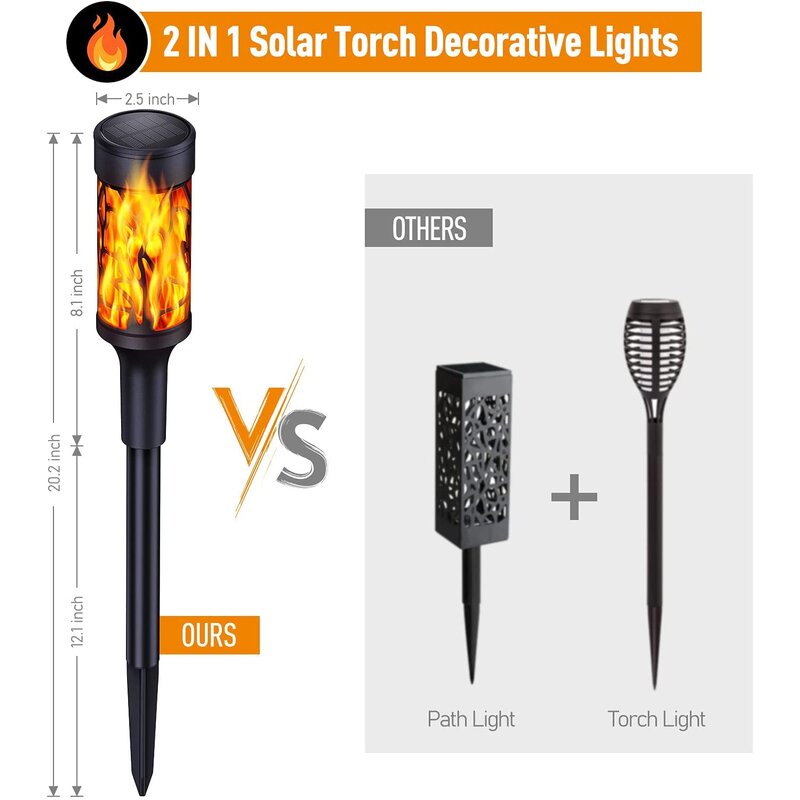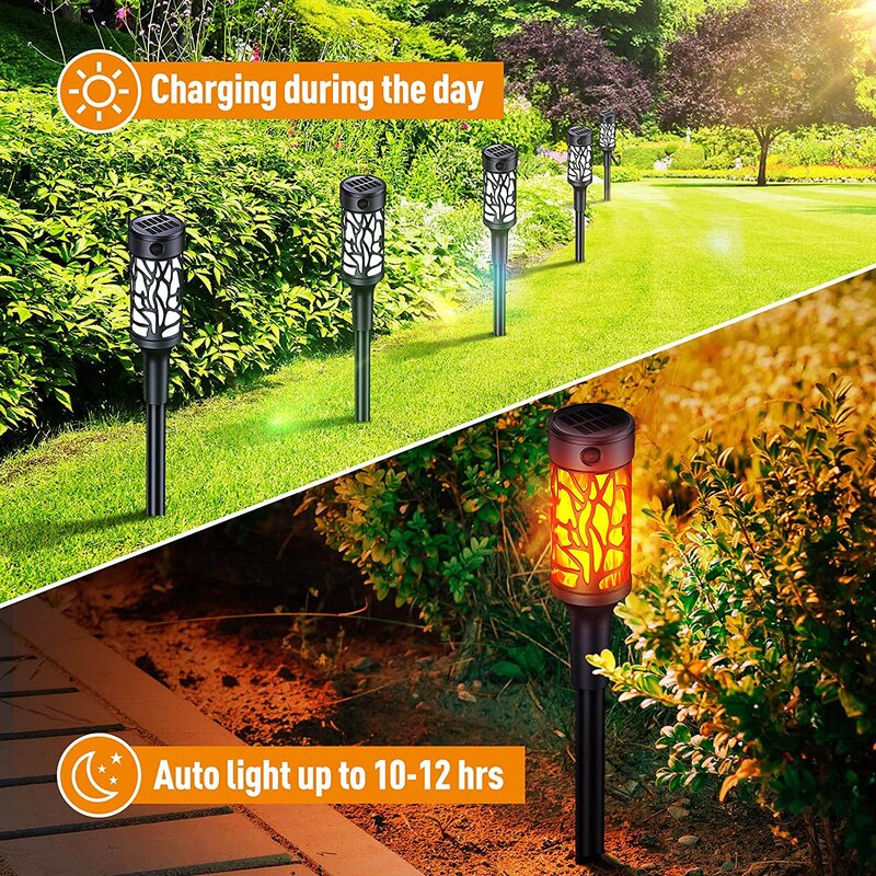 Easy to install and use- No wiring is required at all, the dancing flame torch light collects solar energy all day under direct sunlight. It contains a photosensitive control switch on the solar panel so that it can automatically turn on/off based on the outdoor light, so easy and convenient to use.