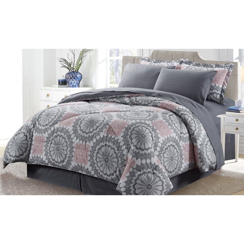 Complete the look of your bedroom and sleep comfortably in your own luxury bed with this Down Alternative 8 Piece Bed in a Bag Set by Bungalow Rose. The set includes 1 Comforter, 1 Bed skirt, 1 Fitted Sheet, 1 Flat Sheet, 2 Shams, and 2 Pillowcases for a complete bed-in-a-bag set. Made of a double-brushed ultra-soft shell with down alternative filling to provide cozy yet breathable warmth. Overfilled. Classic baffle-box design with double-needle stitching prevents blanket filling from shifting and bunching. Smooth, piped edging, and double-needle stitching. Designed to last. Sewn-through construction eliminates shifting for evenly distributed warmth. Machine wash, and air dry.Queen Size Includes:1 Comforter: 90″ x 90″1 Bed skirt: 60″ x 80″ with 14″ drop1 Flat sheet: 90″ x 102″1 Fitted sheet: 60″ x 80 + 12″2 Shams: 20″ x 26″2 Pillowcases: 20″ x 30″King Size Includes:1 Comforter: 101″ x 90″1 Bed skirt: 78″ x 80″ with 14″ drop1 Flat sheet: 108″ x 102″1 Fitted sheet: 78″ x 80 + 12″2 Shams: 20″ x 36″2 Pillowcases: 20″ x 40″