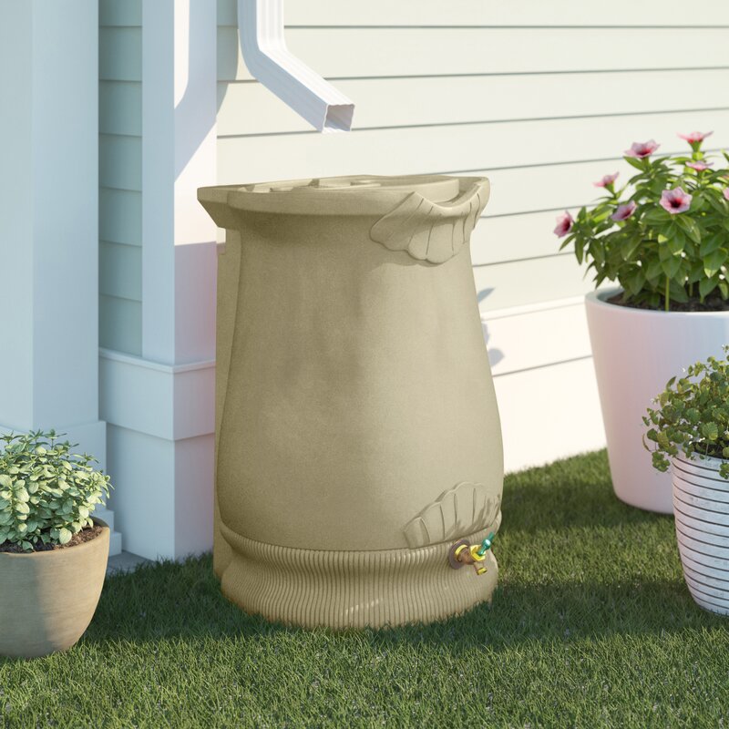 Catch rainwater and complement your outdoor decor all at once with this rain barrel! Crafted in the USA from plastic, this 65-gallon barrel features a design inspired by classic jars with textured accents for a class look anywhere. Plus, thanks to the included brass spigot, you can easily attach a hose or link it to other barrels. Best of all, an included debris screen helps keep this piece free of insects and other pests.