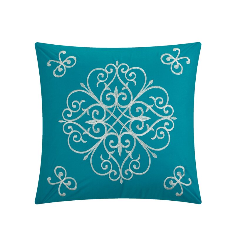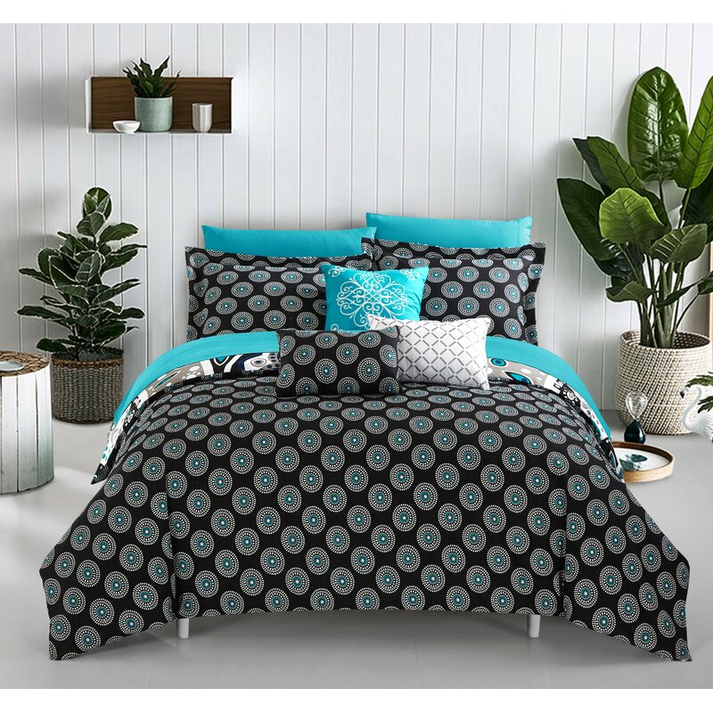 Free your spirit with this amazing large-scale Bohemian Contempo globally inspired look. Detailed hints of black, gray, taupe, and aqua blues, on black grounds truly compliment a true boho chic look. This Binning Reversible Comforter Set also is reversible to a contemporary design allowing you to change the look as per your mood.