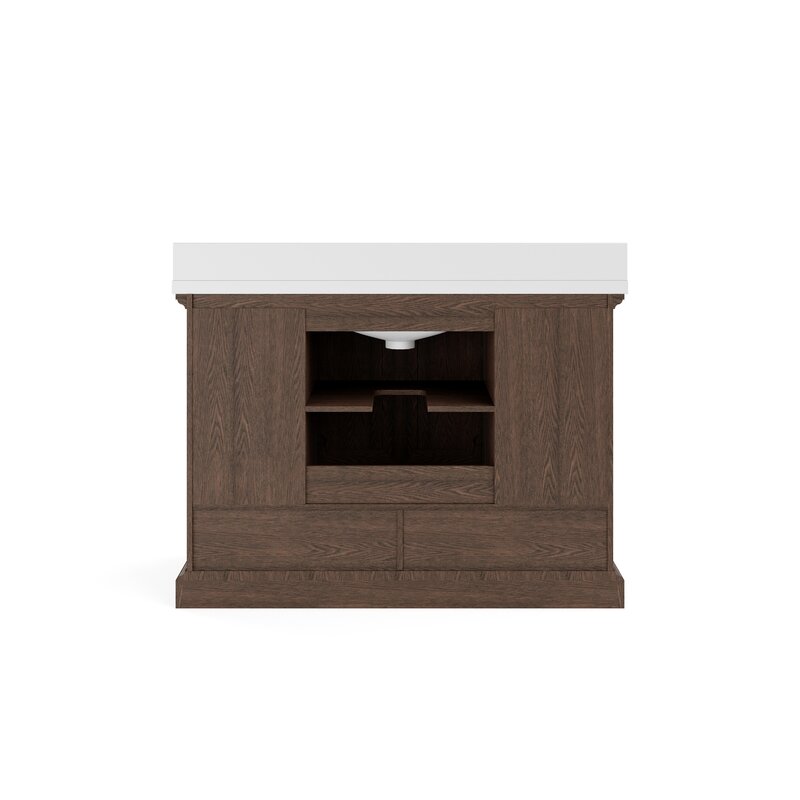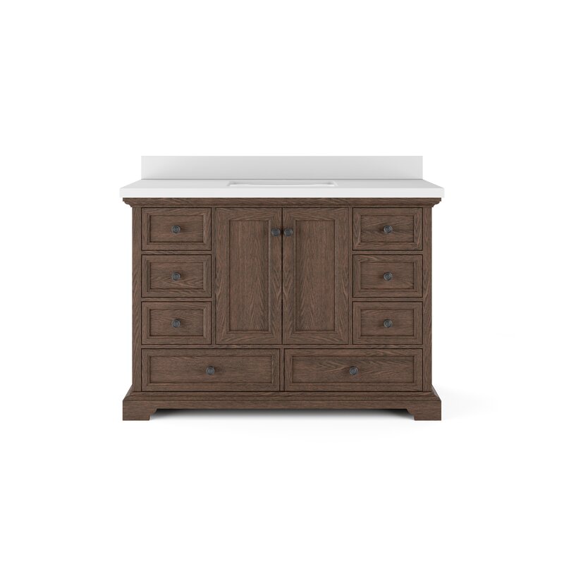 Storage for days! The Gavrielle Collection features a traditional design enhanced by a premium finish. This vanity comes in 2 colors; dark brown finish with dark pewter hardware or elegant white with brushed nickel hardware. This vanity showcases its quality and style with a solid wood frame, elegant hardware, and soft-close hinges and glides. Store all your essentials with its spacious double-door cabinet with an adjustable shelf inside and 8 full drawers. It’s topped with a quartz white top and a white vitreous China under-mount rectangular sink.