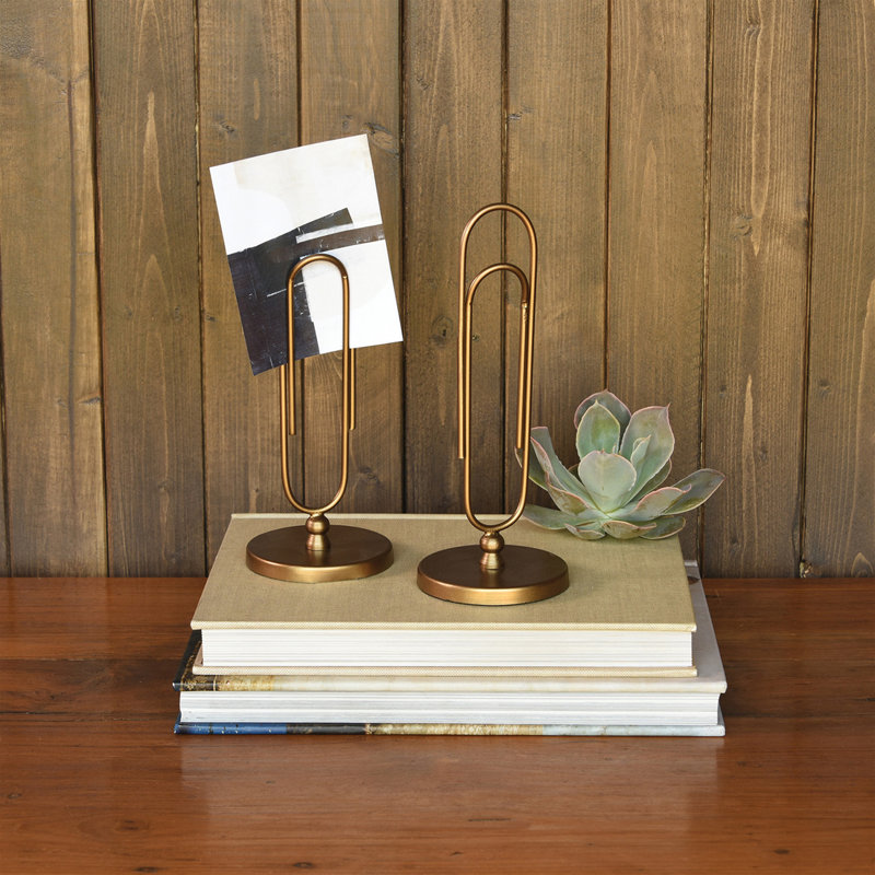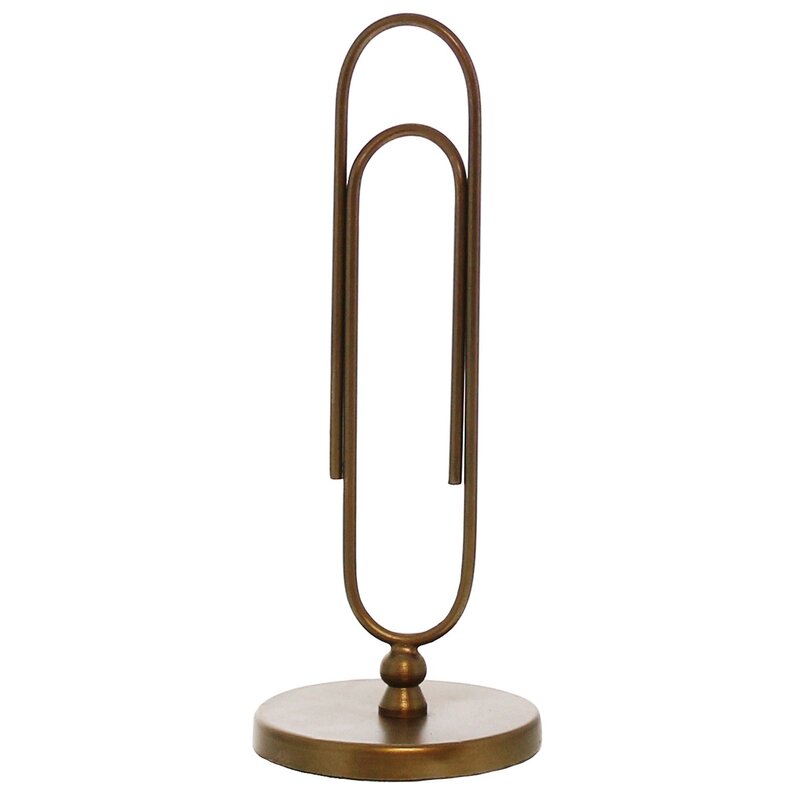 A grand-scaled paper clip is propped vertically on a brass base creating infinite opportunities to clip a photo, a menu, a memo, a to-do list and much more.