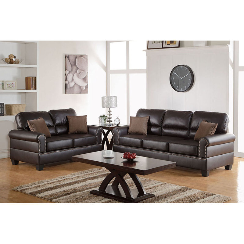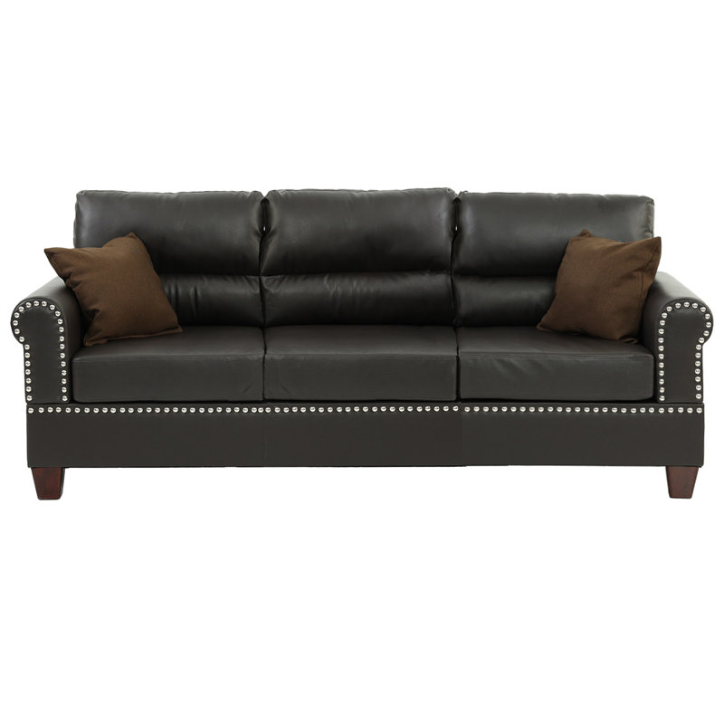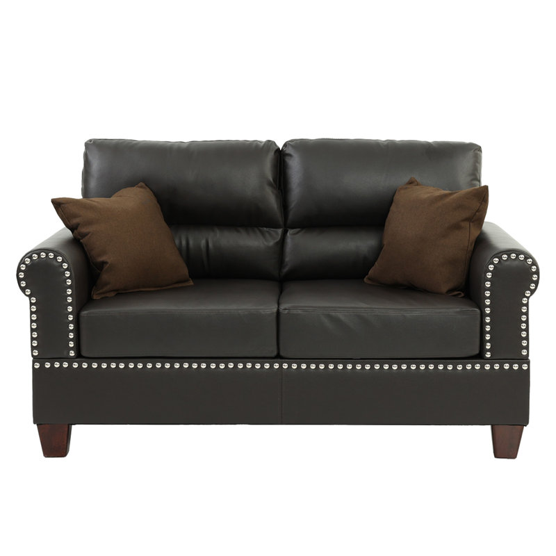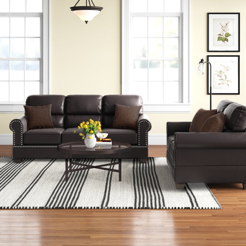 Fit up to five at family film nights or at-home happy hours with this classic two-piece living room set, complete with a sofa, a matching loveseat, and four toss pillows. Founded atop tapered feet finished in black, each design is filled with foam and supported by coil springs to offer a medium seating firmness. Neutral-hued bonded leather upholstery envelops these pieces, offering a budget-friendly faux leather, while nailhead trim highlights their rolled arms and completes the look.