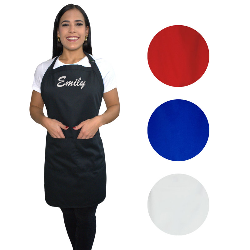 Our personalized embroidered 2-Pocket Bib Adult Apron is part of our professional series collection, giving you durability and quality with comfort and personalized style. Perfect for any culinary enthusiast, whether in the kitchen or at the grill. Our Apron provides great coverage and protection against kitchen grease, spills and food stains. Perfect for family gatherings and a great gift idea for family or friends . Two pockets design in front of the kitchen apron for easy holding recipe cards, cooking tools, cell phone . meat thermometer etc. These aprons are so multi-functional that you can use them when baking, gardening, washing the dog, and working on art projects. The aprons are machine washable, and they resist shrinking and wrinkling; It is recommended to wash with similar colored washables; AVOID dry cleaning, bleaching, and tumble drying. Adjustable neck strap. Size: 29′ Long, 23′ Wide.