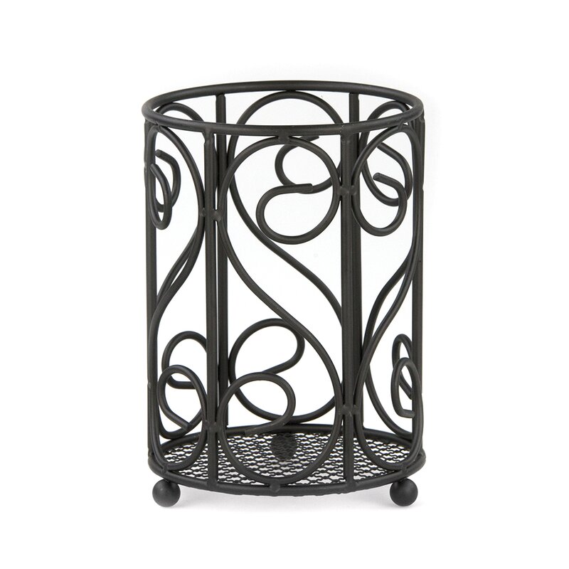 Save precious drawer space by enlisting the help of this elegant utensil holder from the scroll collection. With the fashionable look of wrought iron with the durability of steel, it’s the perfect cutlery holder that combines both form and function. It’s large enough to hold everything but small enough to sit in a small space, keeping everything from your large wooden cooking utensils to silverware and other most frequent-use tools close at hand. Keep it by the stove so you have it within reach when you’re cooking. It fits around 5 utensils without tipping when evenly distributed. Or set it sink-sink, to air out your damp silverware. It features a mesh bottom so that it will not collect dirt or grime, or allow crumbs to fall through. Match this piece with the rest of the Scroll Pantry ware Collection to add a traditional touch to your