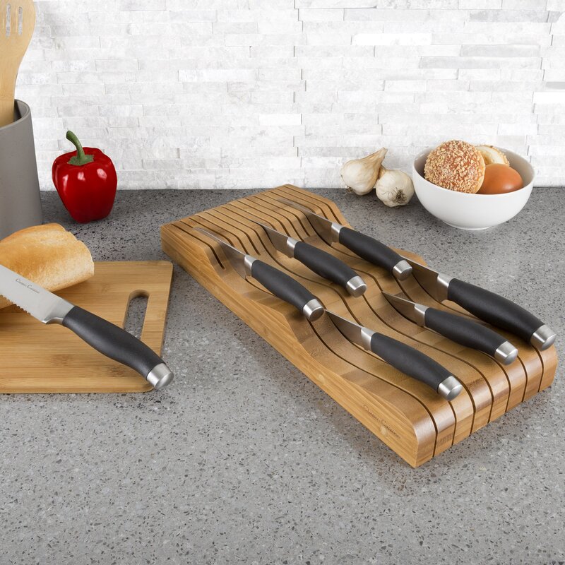 The in-drawer knife block will fit in most kitchen drawers and holds up to 15 knives