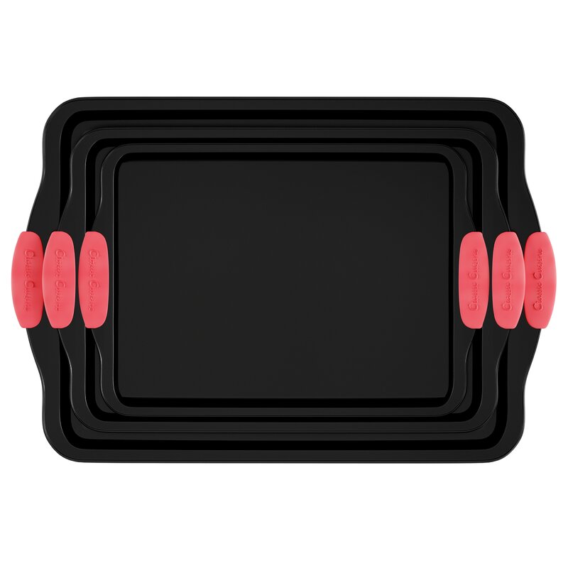 The 3 Piece Non-Stick Baking Pan Set by Classic Cuisine is a kitchen necessity for every home baker! With a large pan, jelly roll pan, and quarter sheet, you will have the right-sized pan for every recipe. The silicone handles provide a safe and secure grip when pulling the hot pans from the oven, while the nonstick surface ensures that none of your delicious treats will get stuck to the pan. These well-crafted and durable baking pans also feature folded edges to help prevent warping. This high-quality set of cookie sheets is essential bakeware for your home and will also make a fantastic and thoughtful gift for birthdays, holidays, housewarmings, weddings, graduations, or any occasion!