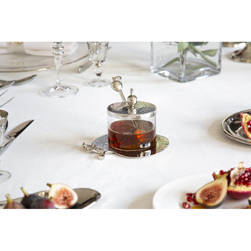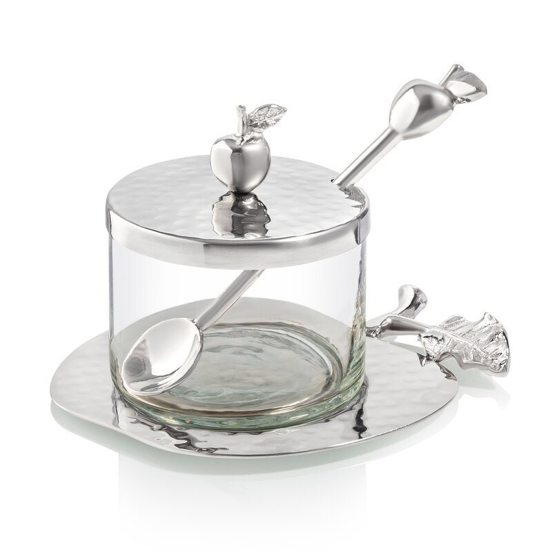 Sweeten up your Holiday festivities with this uniquely shaped honey dish with the spoon. Rendered in hammer tone stainless steel and masterfully designed with vibrant hues of enamel finish, this honey jar with apple-shaped tray serves as the ideal vessel for jam, honey, or just about any confection. What a graceful way to celebrate tradition!
