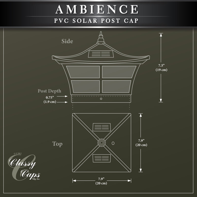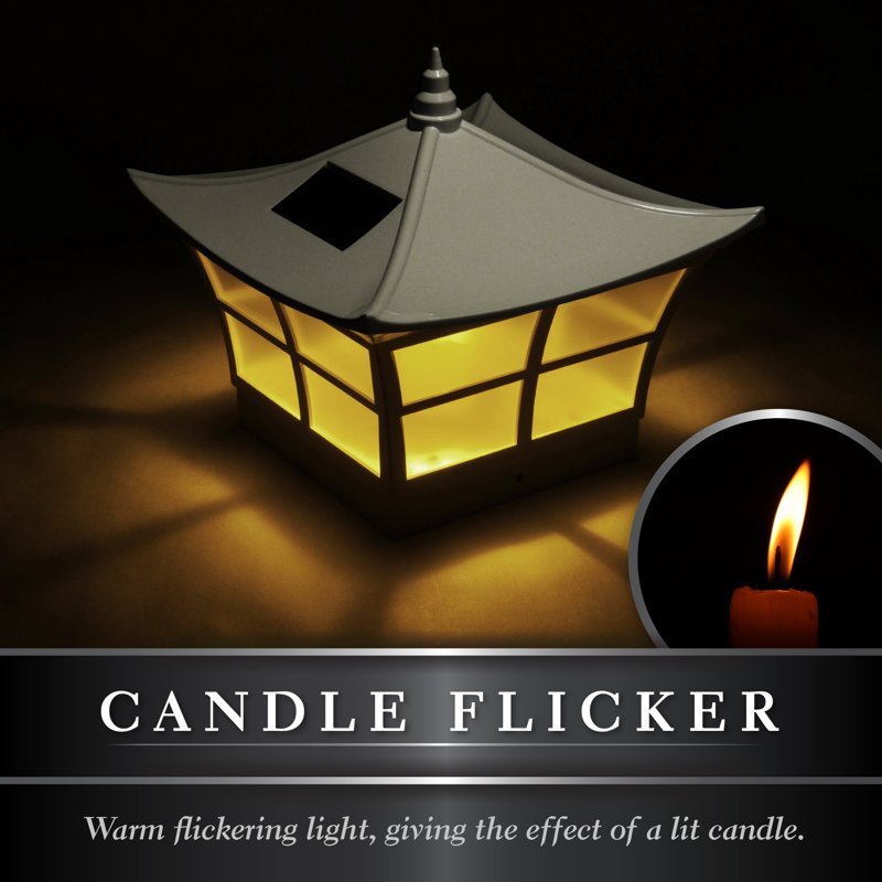 Attractively designed in a Japanese garden style, the patented Ambience solar post cap provides a warm yellow flickering light, giving the effect of a lit candle. Dependable performance with a unique style, the Ambience will fit over an actual 5″x 5″ post.