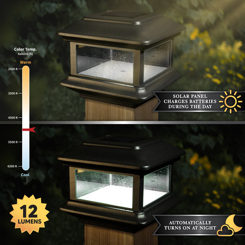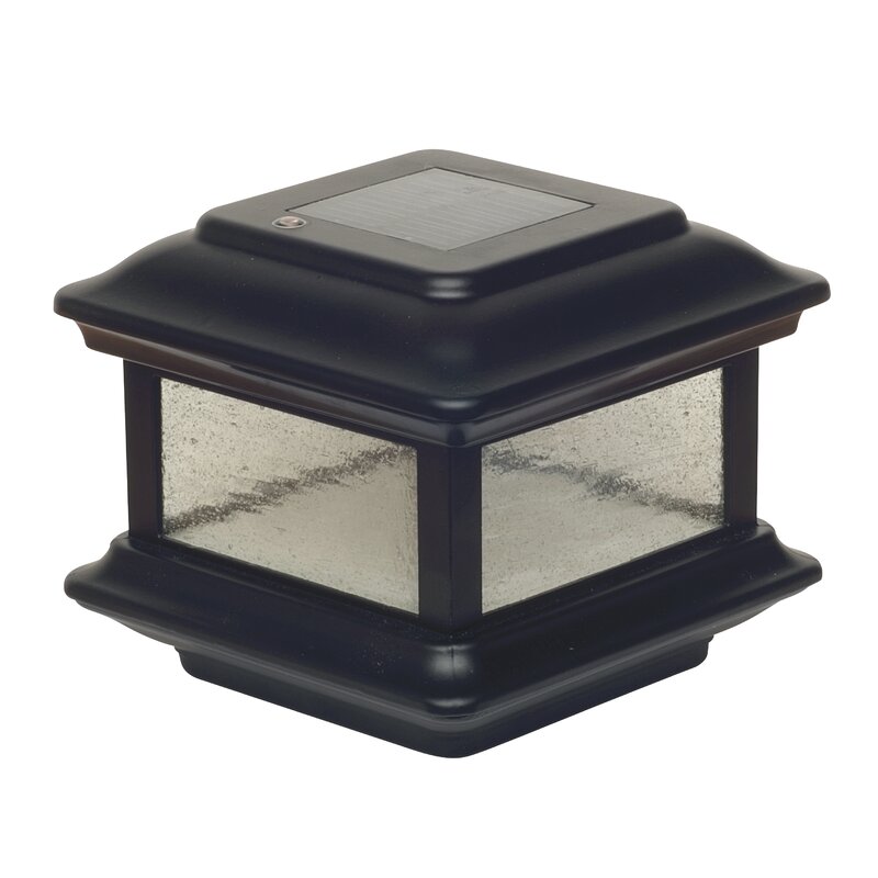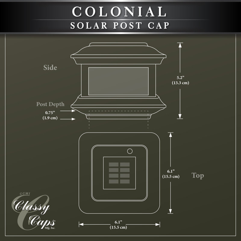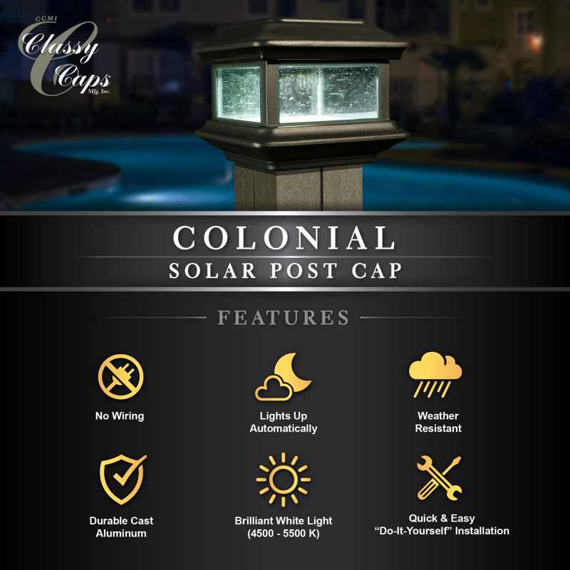 Fabricated from durable cast aluminum with a powder-coated finish, the Colonial Solar Post Cap is designed to fit over a nominal 4†x 4†wood post. (Actual dimension of opening: 3-5/8â€x3-5/8â€). The attractive Colonial is complimented by using real pebbled glass panels. Built to our stringent quality standards it will stay lit for up to 12 hours.