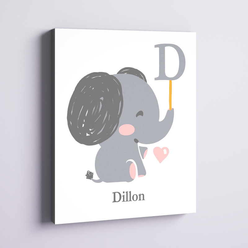 This wall art shows a sweet baby elephant holding a pennant – the first letter of your child’s name, customized! It’s digitally printed with archival, pigment-based inks on artist-quality wrapped canvas. The design features your child’s name below an illustration of a little gray elephant with large ears and pink cheeks, holding a stick with a capital letter in its tiny trunk. This customizable graphic art print comes with mounting hardware, so it’s easy to hang on your child’s bedroom, playroom, or nursery wall.
