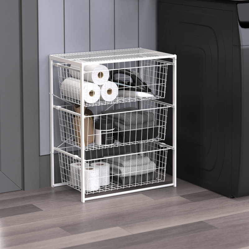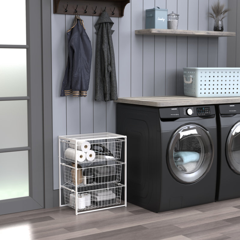 Getting organized is easy with this product. This white, wire storage drawer system is ideal for organizing small spaces like pantries, laundry rooms, mudrooms, closets, and more. Store items like toiletries, canisters, towels, or other small items to clear the clutter from your living spaces.