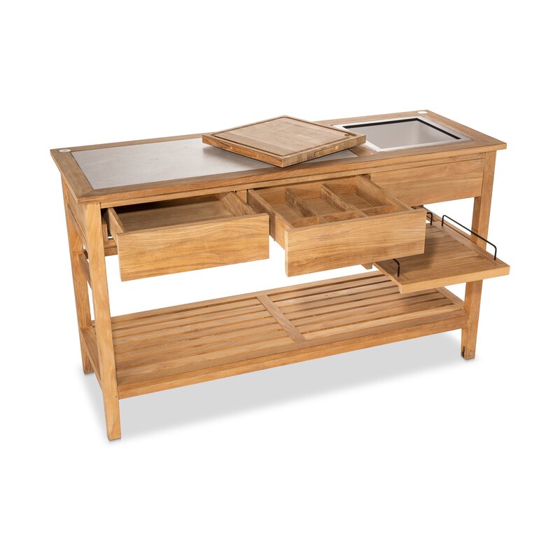 This classic dodger buffet table stands out with its modern flair. Made of solid teak and a ceramic top in winter, this buffet table pairs nicely with many of our other collections. With drawers, multiple shelves, and an insulated ice bucket below a cutting board, this buffet table provides functionality to satisfy all of your entertaining needs.