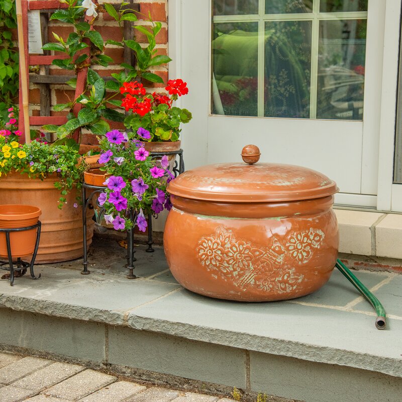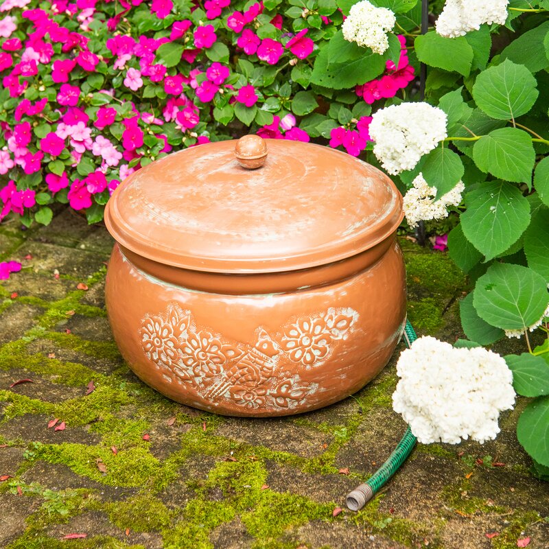 This water hose holder is the perfect solution to your bulky garden hose wrapped up in a messy pile on the side of your house. This metal container keeps your hose hidden while acting as a beautiful addition to your outdoor decorations. Not only is this for beauty but also for function. It holds a garden hose up to 150 ft. in length, depending on hose style. Say goodbye to tacky hoses and hello to beautiful metal décor! This hose pot has a terracotta look to it with a green patina sprucing up your outdoor decor with an antique look. This hose pot can also be used to give a facelift to your indoor space by storing firewood, magazines, or blankets. Give your garden water hose a place to call home with this decorative metal hose pot with a terracotta finish.