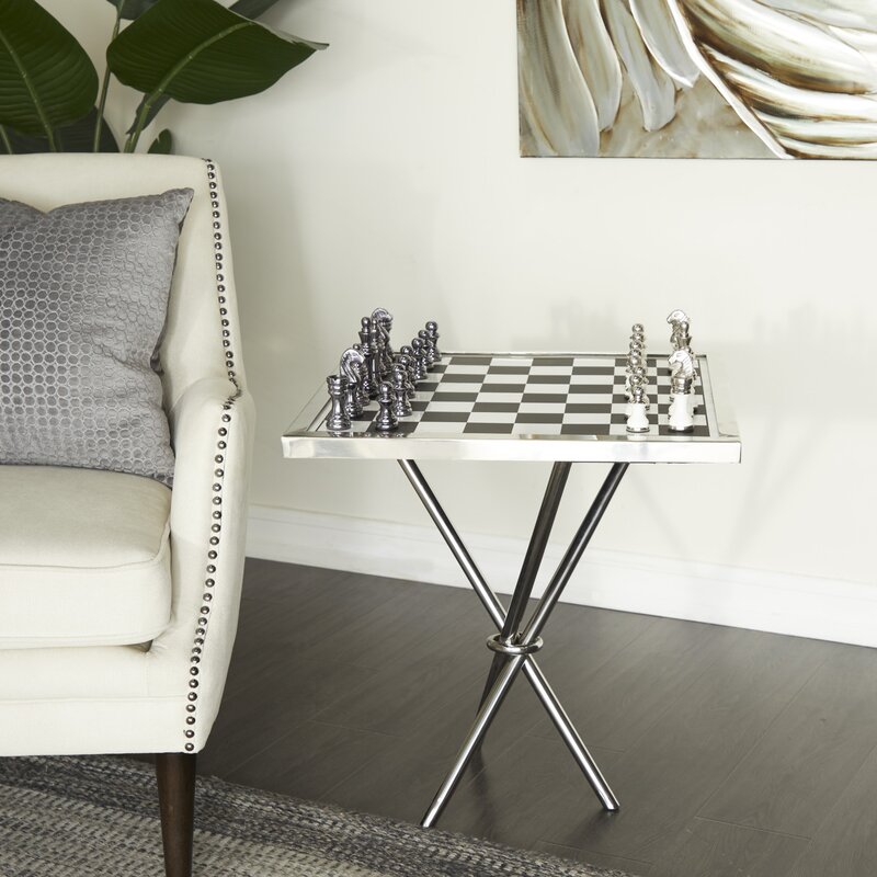 Showoff your competitive side and keep your guest entertain with this game set. A sleek and sophisticated display with a playful touch. Enjoy a game of wit and strategy with this posh and elegant chess board table for your living room or home office corners. This item ships in 1 carton. Aluminum game set makes a great gift for any occasion. Suitable for indoor use only. Maximum weight limit is 25 lbs. Made in India. This is a single colored decorative board game. Contemporary style.