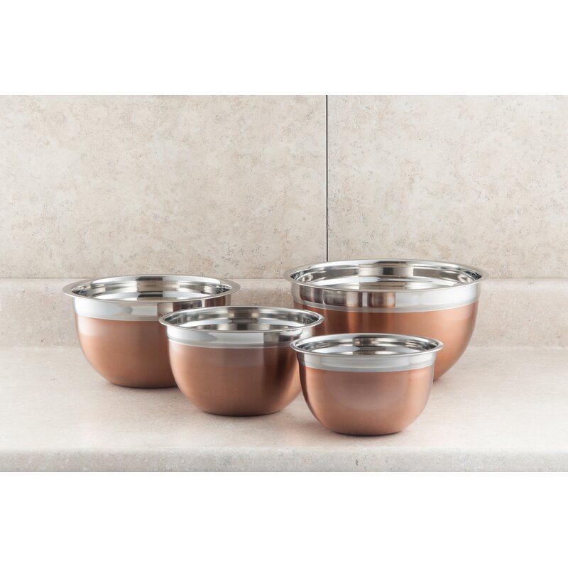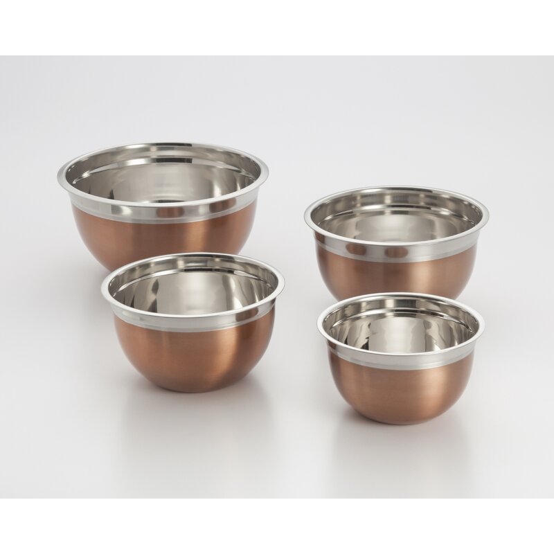All-purpose, versatile German stainless steel mixing bowl that is essential to your everyday kitchen needs. In durable stainless, features a contrasting dual copper tint to accent your kitchen. Designed to add character and elegance to any kitchen. Nested storage for best utilization of space.