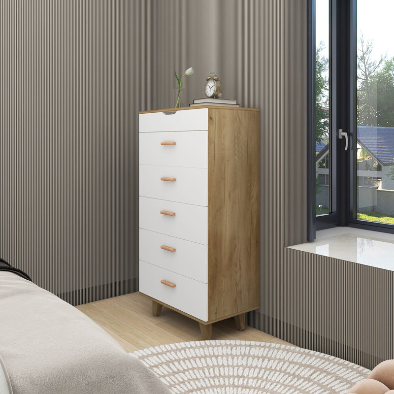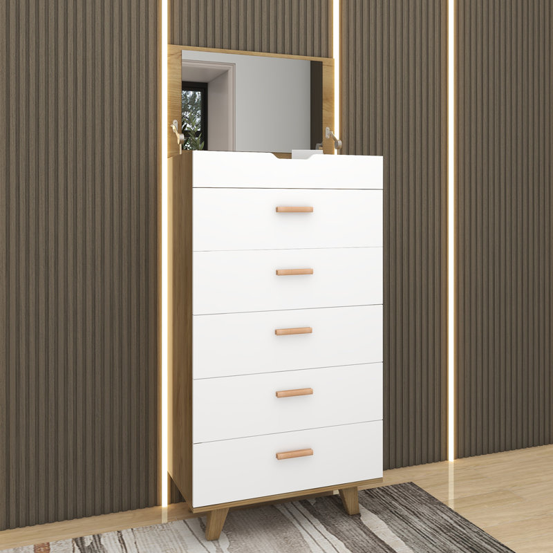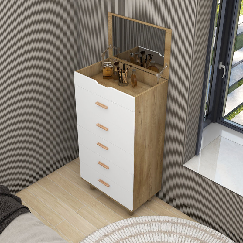 Wood 5 Drawer Dresser with Mirror,Mid Century Modern Chest of Drawers for Bedroom,Natural Wood Dresser
