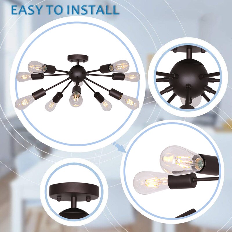 10 bulbs surround a brushed brass finish metal ball in the center, adding vintage character to any interior with its trendy look, especially gorgeous for a living room, or dining room, but also beautiful for the cafe bar. Industrial Sputnik arm with lamp socket and bare shade reveal and maximize vintage Edison bulb lights.